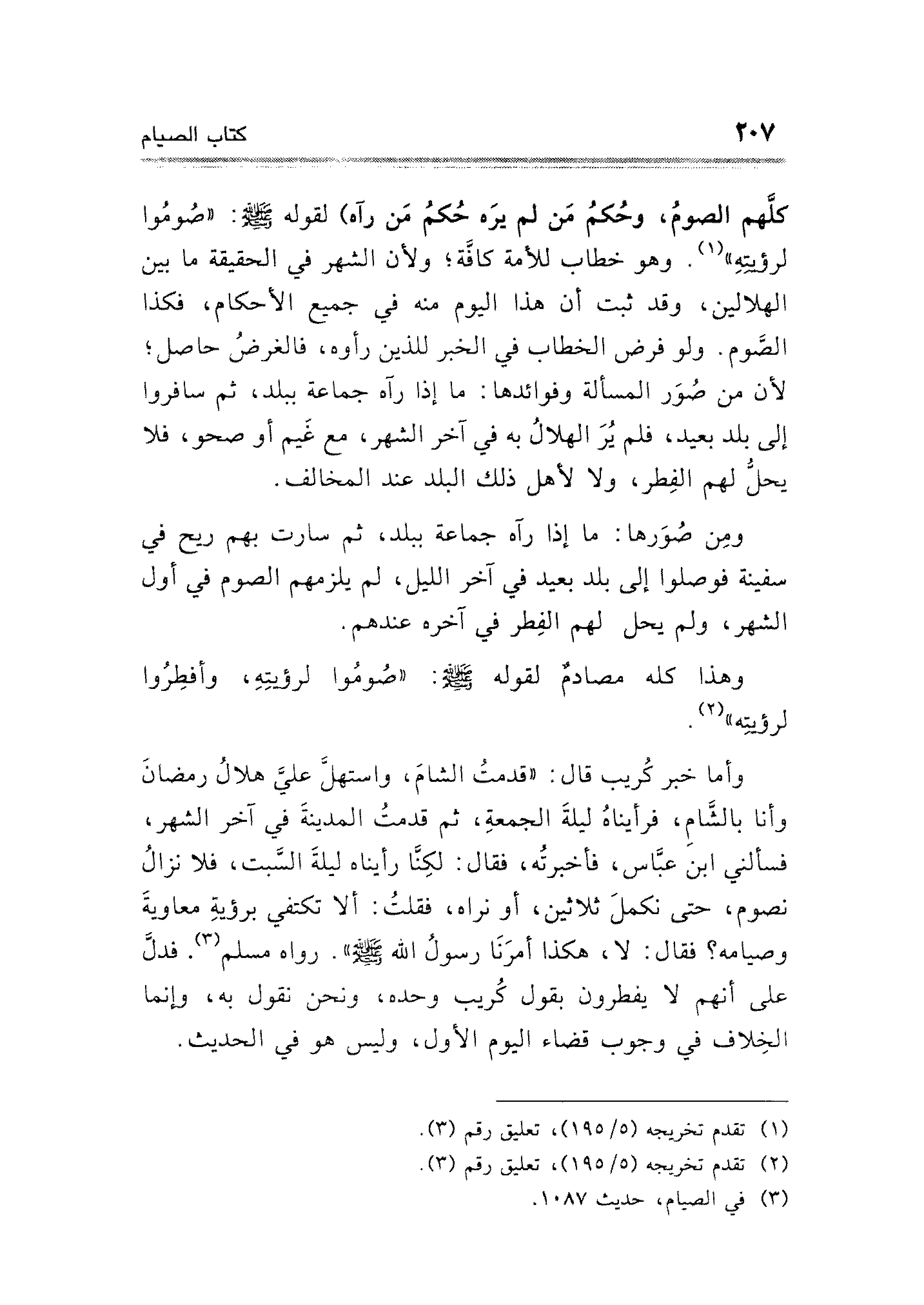 وأما خبر كُريب قال: "قدمتُ الشامَ، واستهل عليَّ هلالُ رمضانَ وأنا بالشَّامِ، فرأيناهُ ليلةَ الجمعةِ، ثم قدمتُ المدينةَ في آخر الشهر، فسألني ابن عباس، فأخبرتُه، فقال: لكِنَّا رأيناه ليلةَ السَّبت، فلا نزالُ نصوم، حتى نكملَ ثلاثِين، أو نراه، فقلتُ: ألا تكتفي برؤيةِ معاويةَ وصيامه؟ فقال: لا، هكذا أمرَنَا رسولُ الله - صلى الله عليه وسلم - ". رواه مسلم (¬٣). فدلَّ على أنهم لا يفطرون بقول كُريب وحده، ونحن نقول به، وإنما الخلاف في وجوب قضاء اليوم الأول، وليس هو في الحديث.