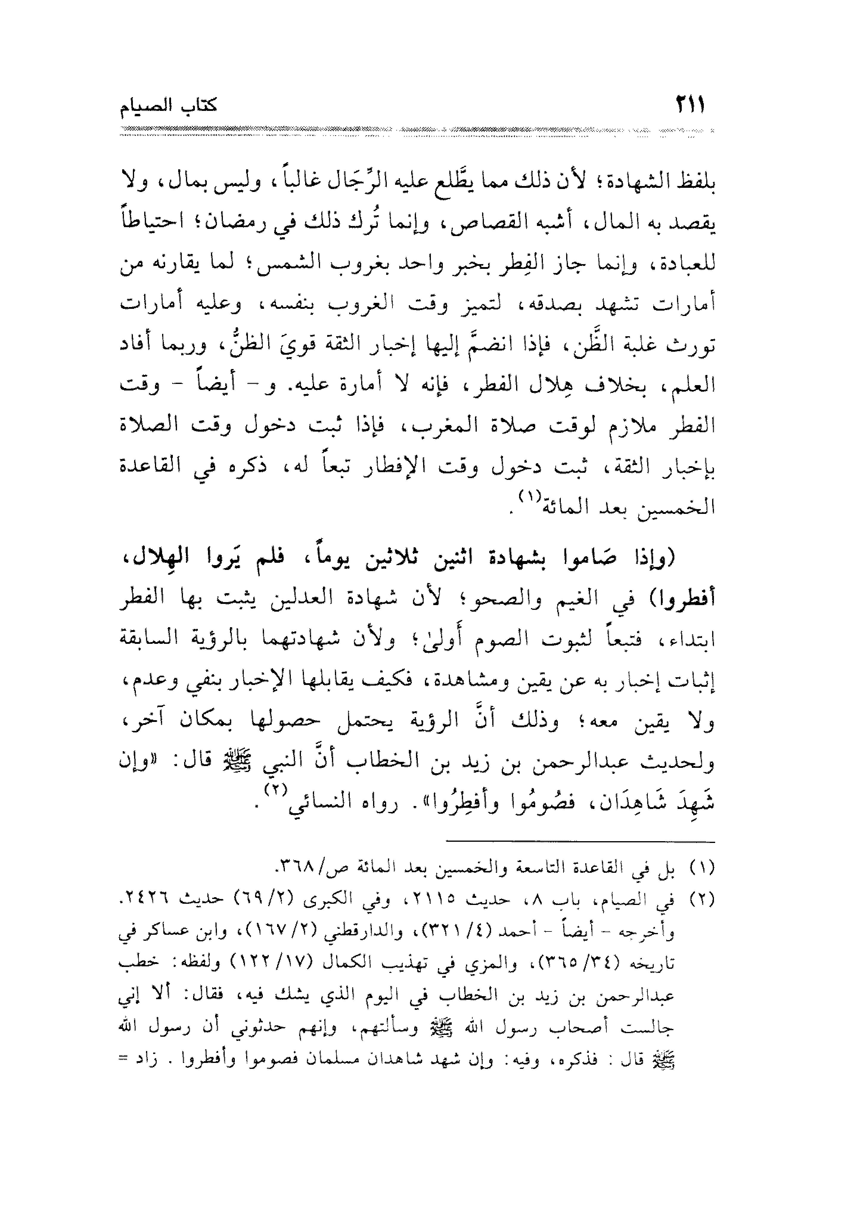 (وإذا صَاموا بشهادة اثنين ثلاثين يومًا، فلم يَروا الهِلال، أفطروا)، في الغيم والصحو؛ لأن شهادة العدلين يثبت بها الفطر ابتداء، فتبعًا لثبوت الصوم أولى؛ ولأن شهادتهما بالرؤية السابقة إثبات إخبار به عن يقين ومشاهدة، فكيف يقابلها الإخبار بنفي وعدم، ولا يقين معه؛ وذلك أنَّ الرؤية يحتمل حصولها بمكان آخر، ولحديث عبد الرحمن بن زيد بن الخطاب أن النبي - صلى الله عليه وسلم - قال: "إن شَهِدَ شَاهِدَان، فصُومُوا وأفطِروا" رواه النسائي (¬٢).