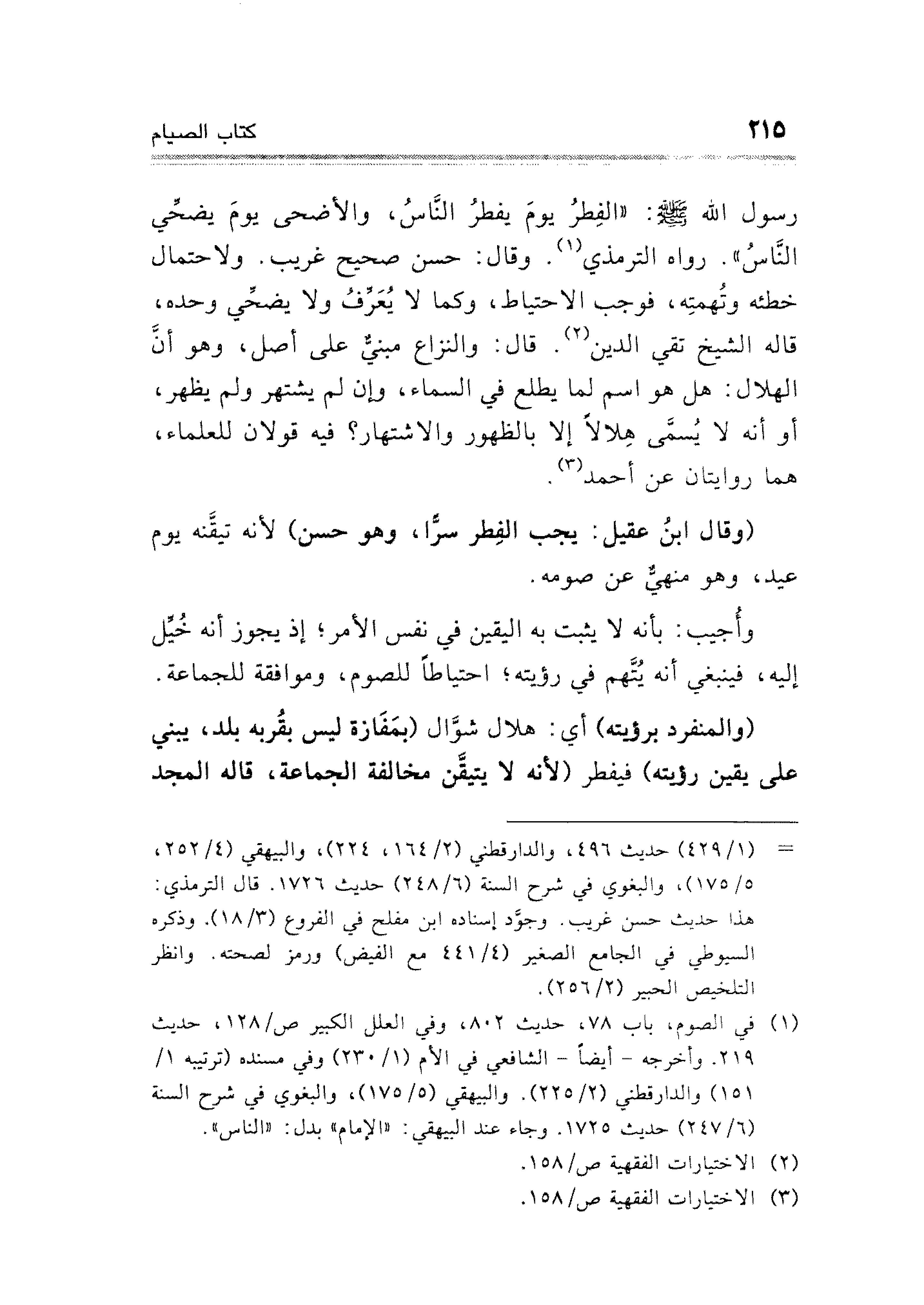 رسول الله - صلى الله عليه وسلم -: "الفِطر يوم يفطر الناسُ، والأضحى يوم يضحي الناس". رواه التِّرمذيُّ (¬١). وقال: حسن صحيح غريب. ولاحتمال خطئه وتُهمتِه، فوجب الاحتياط، وكما لا يُعَرفُ ولا يضحي وحده، قاله الشَّيخ تقي الدين (¬٢). قال: والنزاع مبني على أصل، وهو أن الهلال: هل هو اسم لما يطلع في السماء، وإن لم يشتهر ولم يظهر، أو أنَّه لا يُسمَّى هِلالًا إلَّا بالظهور والاشتهار؟ فيه قولان للعلماء، هما روايتان عن أحمد (¬٣).