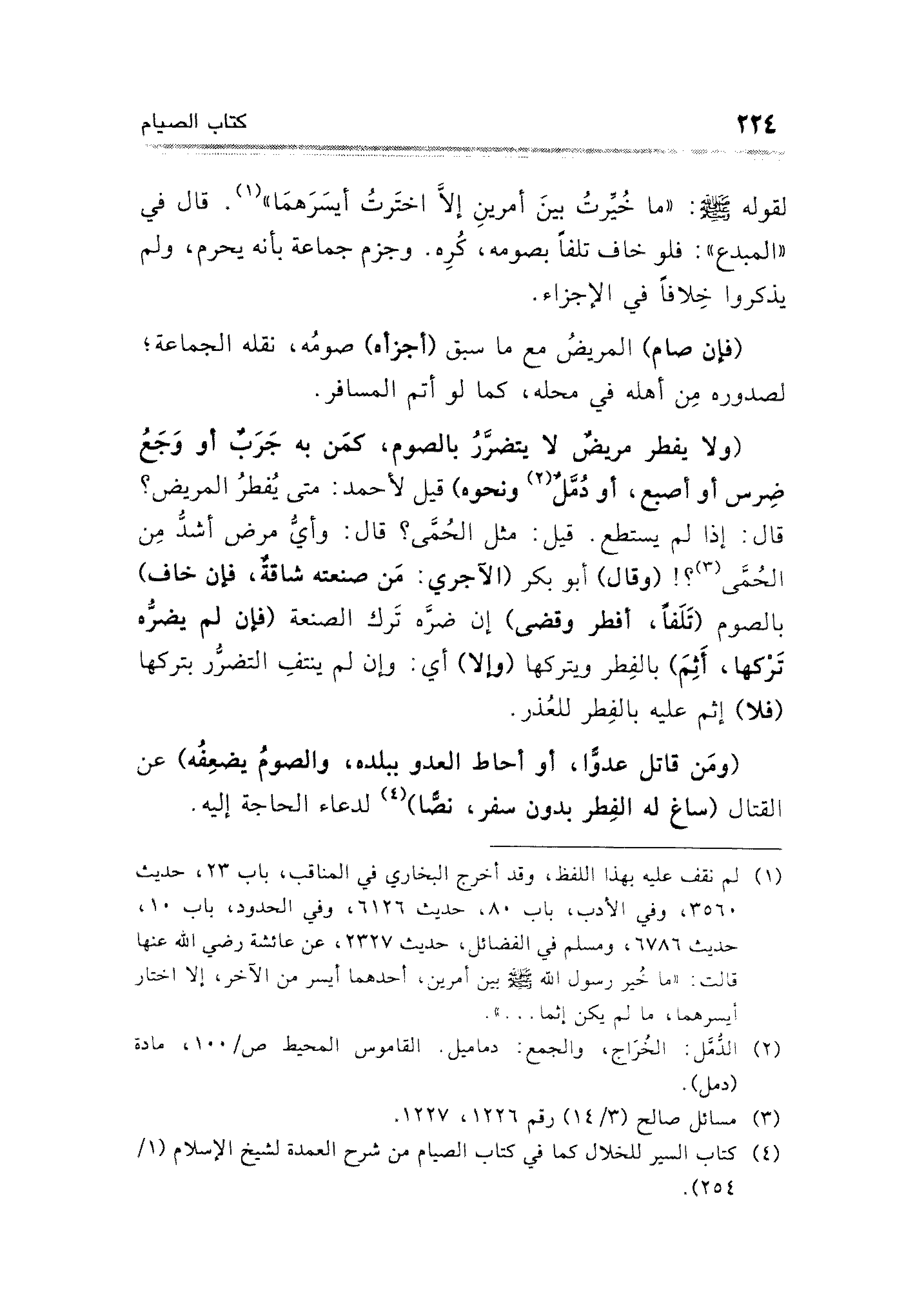 (ولا يفطر مريضٌ لا بتضرَّرُ بالصوم، كمَن به جَرَبٌ أو وَجَعُ ضِرس أو أصبع، أو دُمَّلٌ (¬٢) ونحوه) قيل لأحمد: متى يُفطرُ المريض؟ قال: إذا لم يستطع. قيل: مثل الحُمَّى؟ قال: وأْيُّ مرض أشدُّ مِن الحُمَّى (¬٣)؟! (وقال) أبو بكر (الآجري: مَن صنعته شاقةٌ، فإن خاف) يالصوم (تَلَفًا؛ أفطر وقضى) إن ضرَّه تَرك الصنعة (فإن لم يضرُّه تَرْكها؛ أَثِمَ) بالفِطر ويتركها (وإلا) أي: وإن لم ينتفِ التضرُّر بتركها (فلا) إثم عليه بالفِطر للعُذر.