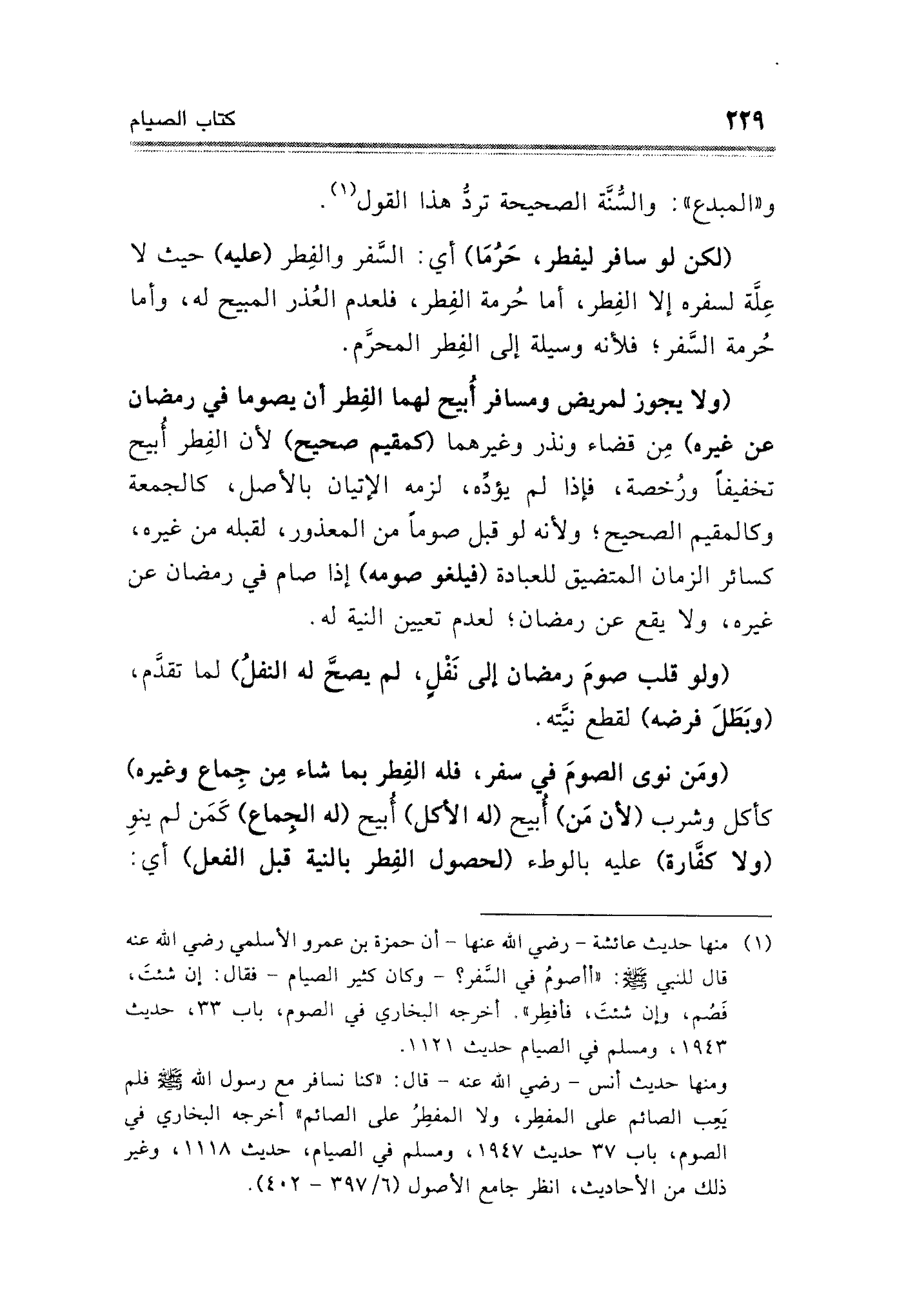 (¬١) منها حديث عائشة - رضي الله عنها - أن حمزة بن عمرو الأسلمي رضي الله عنه قال للنبي - صلى الله عليه وسلم -: "أأصومُ في السَّفر؟ -وكان كثير الصيام- فقال: إنا شئتَ، فصُم، وإن شئتَ، فأفطِر". أخرجه البخاري في الصوم، باب ٣٣، حديث ١٩٤٣، ومسلم في الصيام حديثه ١١٢١.