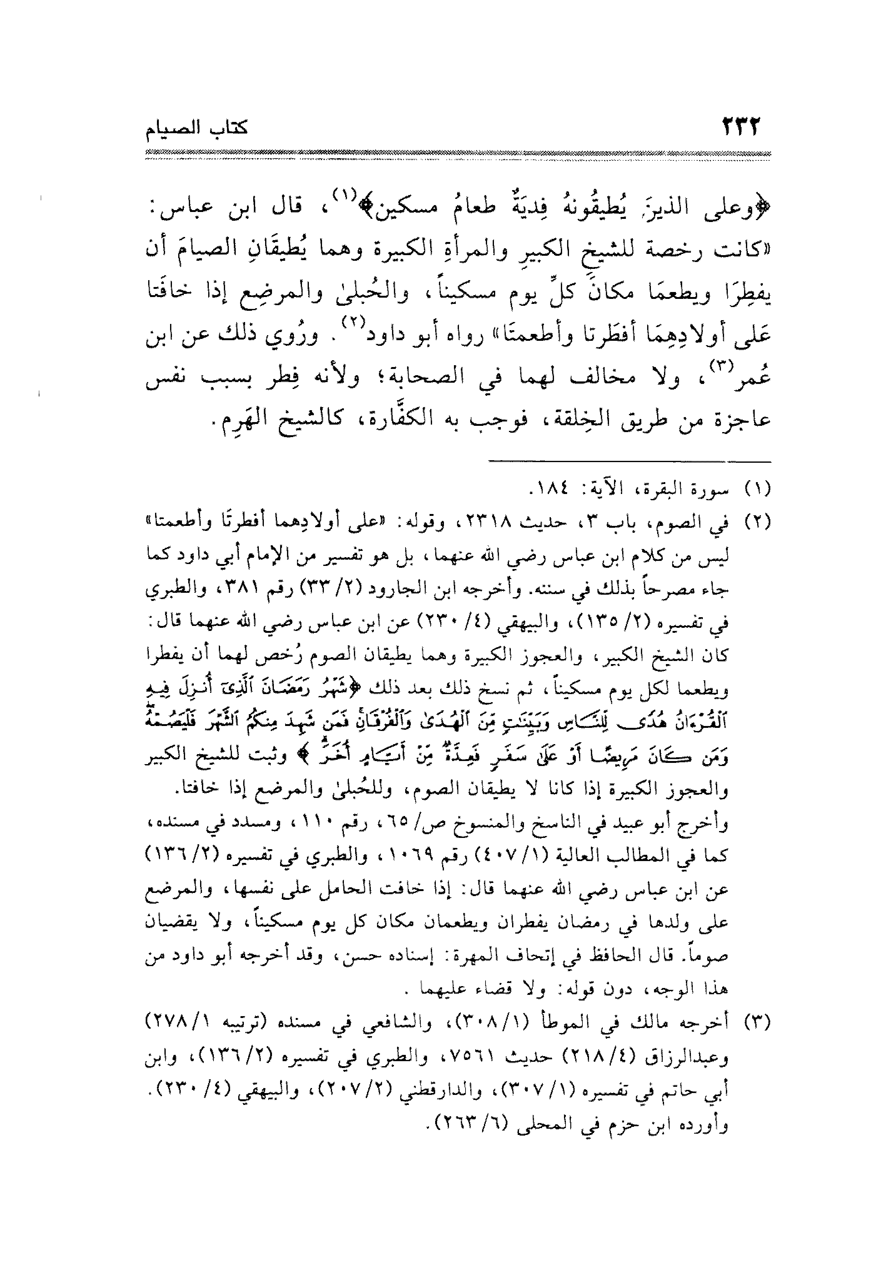 (¬٢) في الصوم، باب ٣، حديث ٢٣١٨، وقوله: "على أولادِهما أفطرتَا وأطعمتا" ليس من كلام ابن عباس رضي الله عنهما، بل هو تفسير من الإمام أبي داود كما جاء مصرحًا بذلك في سننه. وأخرجه ابن الجارود (٢/ ٣٣) رقم ٣٨١، والطبري في تفسيره (٢/ ١٣٥)، والبيهقي (٤/ ٢٣٠) عن ابن عباس رضي الله عنهما قال: كان الشيخ الكبير، والعجوز الكبيرة وهما يطيقان الصوم رُخص لهما أن يفطرا ويطعما لكل يوم مسكينًا، ثم نسخ ذلك بعد ذلك {شَهْرُ رَمَضَانَ الَّذِي أُنْزِلَ فِيهِ الْقُرْآنُ هُدًى لِلنَّاسِ وَبَيِّنَاتٍ مِنَ الْهُدَى وَالْفُرْقَانِ فَمَنْ شَهِدَ مِنْكُمُ الشَّهْرَ فَلْيَصُمْهُ وَمَنْ كَانَ مَرِيضًا أَوْ عَلَى سَفَرٍ فَعِدَّةٌ مِنْ أَيَّامٍ أُخَرَ} وثبت للشيخ الكبير والعجوز الكبيرة إذا كانا لا يطقيان الصوم، وللحُبلى والمرضع إذا خافتا.