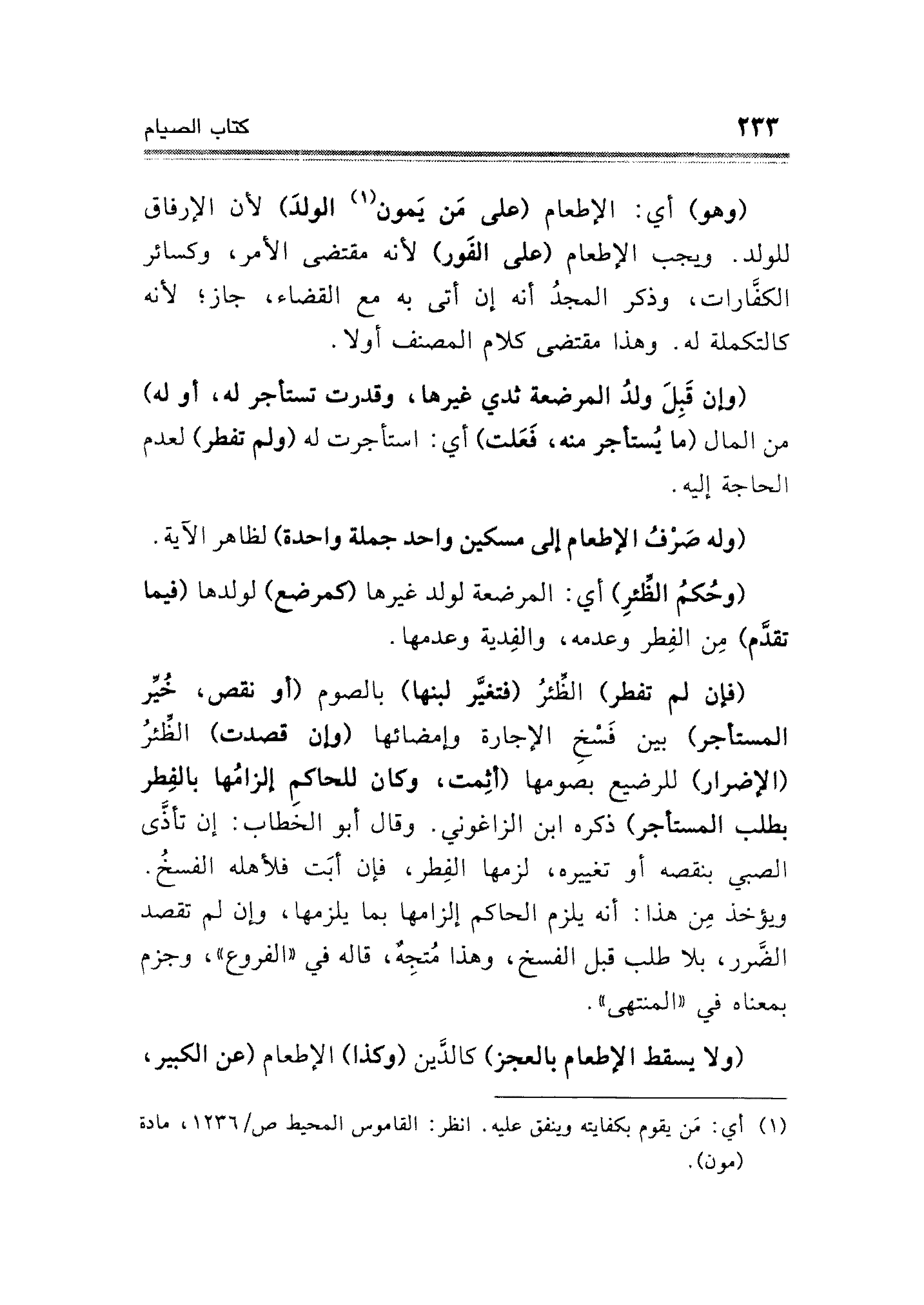 (فإن لم تفطر) الظئر (فتغير لبنها) بالصوم (أو نقص، خير المستأجر) بين فَسخِ الإجارة وإمضائها (وأن قصدت) الظئرُ (الإضرار) للرضيع بصومها (أثِمت، وكان للحاكمِ إِلزامها بالفِطر بطلب المستأجر) ذكره ابن الزاغوني. وقال أبو الخطاب: إن تأذَّى الصبي بنقصه أو تغييره، لزمها الفِطر، فإن أبَت فلأهله الفسخ. ويؤخذ مِن هذا: أنه يلزم الحاكم إلزامها بما يلزمها، وإن لم تقصد الضرر، بلا طلب قبل الفسخ، وهذا مُتجِهٌ، قاله في "الفروع"، وجزم بمعناه في "المنتهى".