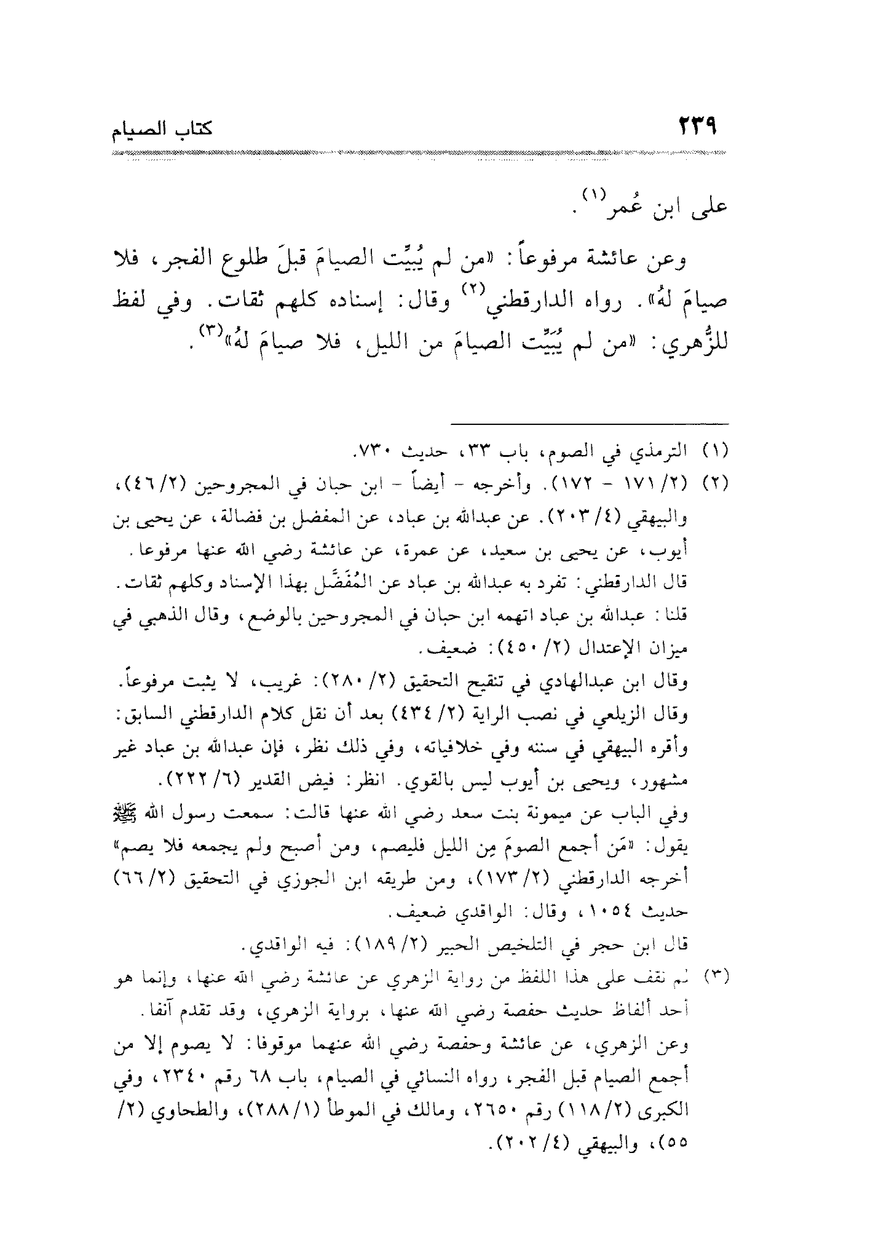 وعن عائشة مرفوعًا: "من لم يُبيّت الصيامَ قبلَ طلوع الفجر، فلا صيامَ لهُ". رواه الدارقطني (¬٢) وقال: إسناده كلهم ثقات. وفي لفظ للزُّهري: "من لم يُبَيت الصيامَ من الليل، فلا صيامَ لهُ" (¬٣).