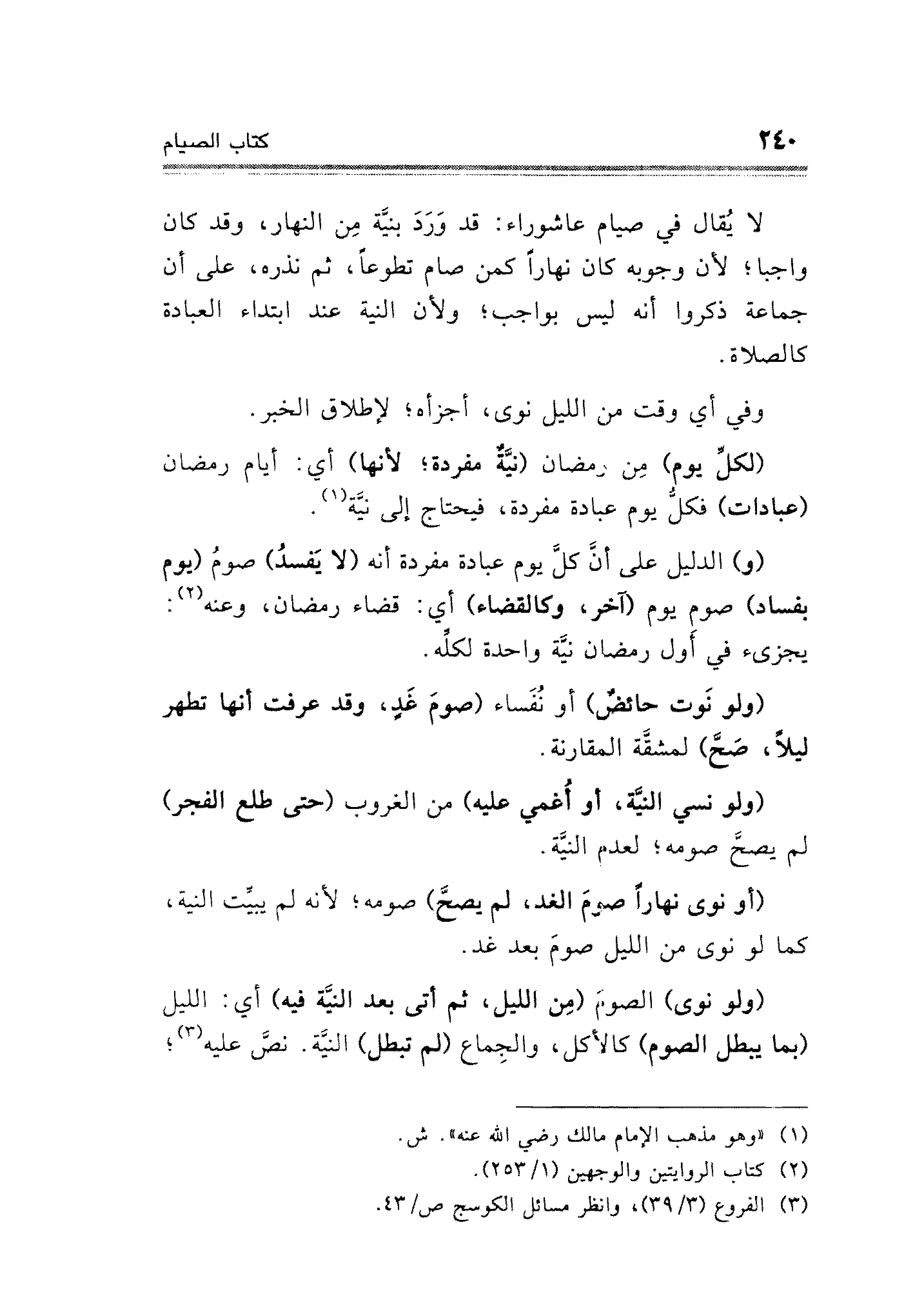 لا يُقال في صيام عاشوراء: قد وَرَدَ بنيَّة مِن النهار، وقد كان واجبا؛ لأن وجوبه كان نهارًا كمن صام تطوعًا، ثم تذره، على أن جماعة ذكروا أنه ليس بواجب؛ ولأن النية عند ابتداء العبادة كالصلاة.