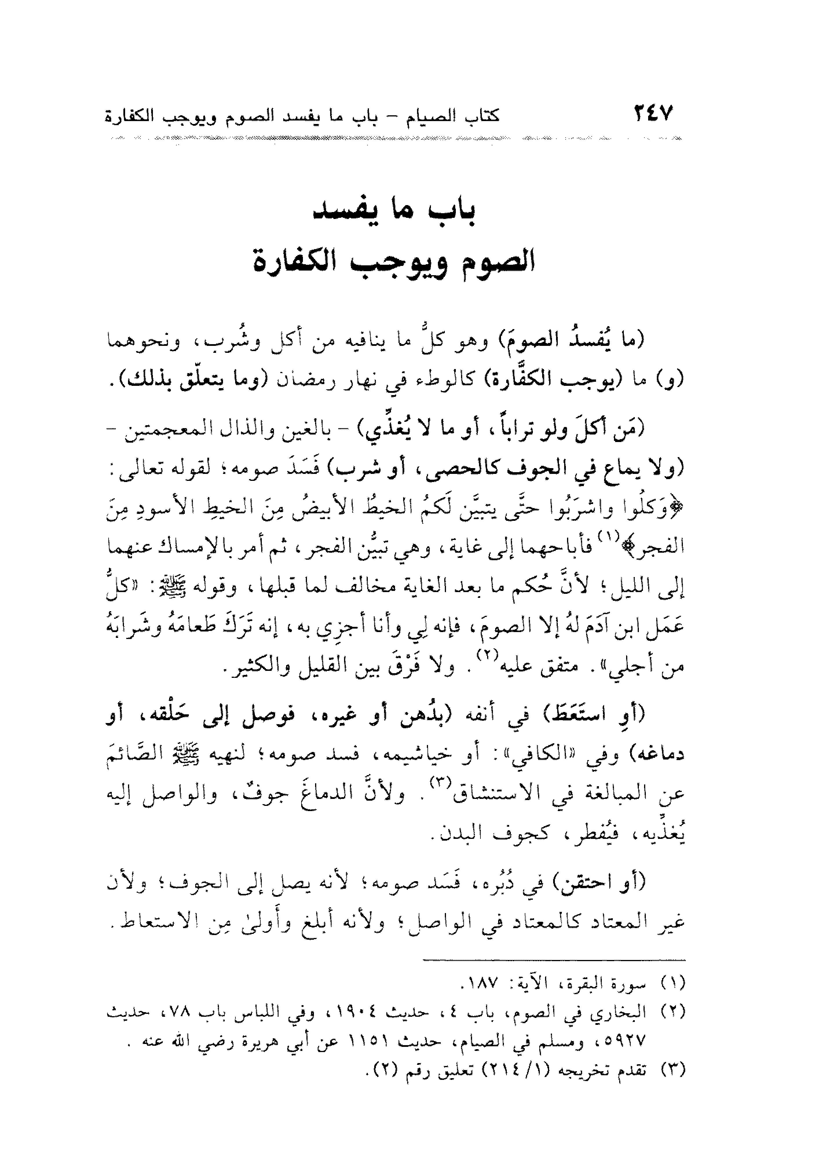 (مَن أكل ولو ترابًا، أو ما لا يُغذِّي -بالغين والذال المعجمتين- (ولا يماع في الجوف كالحصى، أو شرب) فسد صومه؛ لقوله تعالى: {وَكُلُوا وَاشْرَبُوا حَتَّى يَتَبَيَّنَ لَكُمُ الْخَيْطُ الْأَبْيَضُ مِنَ الْخَيْطِ الْأَسْوَدِ مِنَ الْفَجْرِ} (¬١) فأباحهما إلى غاية، وهي تبين الفجر، ثم أمر بالإمساك عنهما إلى الليل؛ لأنَّ حُكم ما بعد الغاية مخالف لما قبلها، وقوله - صلى الله عليه وسلم -: "كلُّ عَمَل ابن آدمَ له إلا الصوم، فإنه لي وأنا أجزي به، إنه ترَكَ طَعامَهُ وشَرابَهُ من أجلي". متفق عليه (¬٢). ولا فَرق بين القليل والكثير.