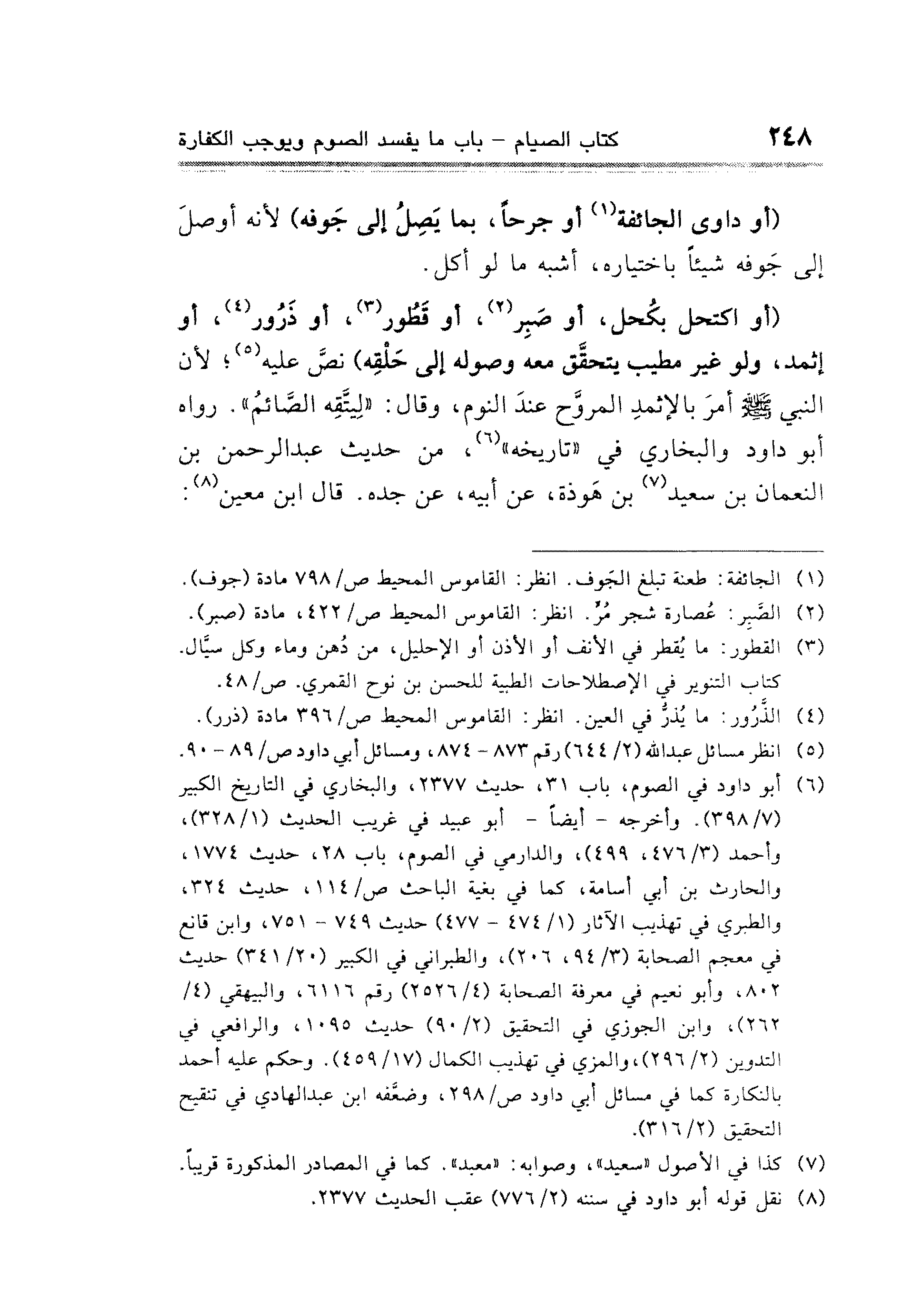 (أو اكتحل بكُحل، أو صَبِر (¬٢)، أو قَطُور (¬٣)، أو ذَرُور (¬٤)، أو إثمد، ولو غير مطيب يتحقَّق معه وصوله إلى حَلْقِه) نصَّ عليه (¬٥)؛ لأن النبي - صلى الله عليه وسلم - أمرَ بالإثمدِ المروَّح عندَ النوم، وقال: "ليتقِه الصائمُ". رواه أبو داود والبخاري في "تاريخه" (¬٦)، من حديث عبد الرحمن بن النعمان بن سعيد (¬٧) بن هَوذة، عن أبيه، عن جده. قال ابن معين (¬٨):