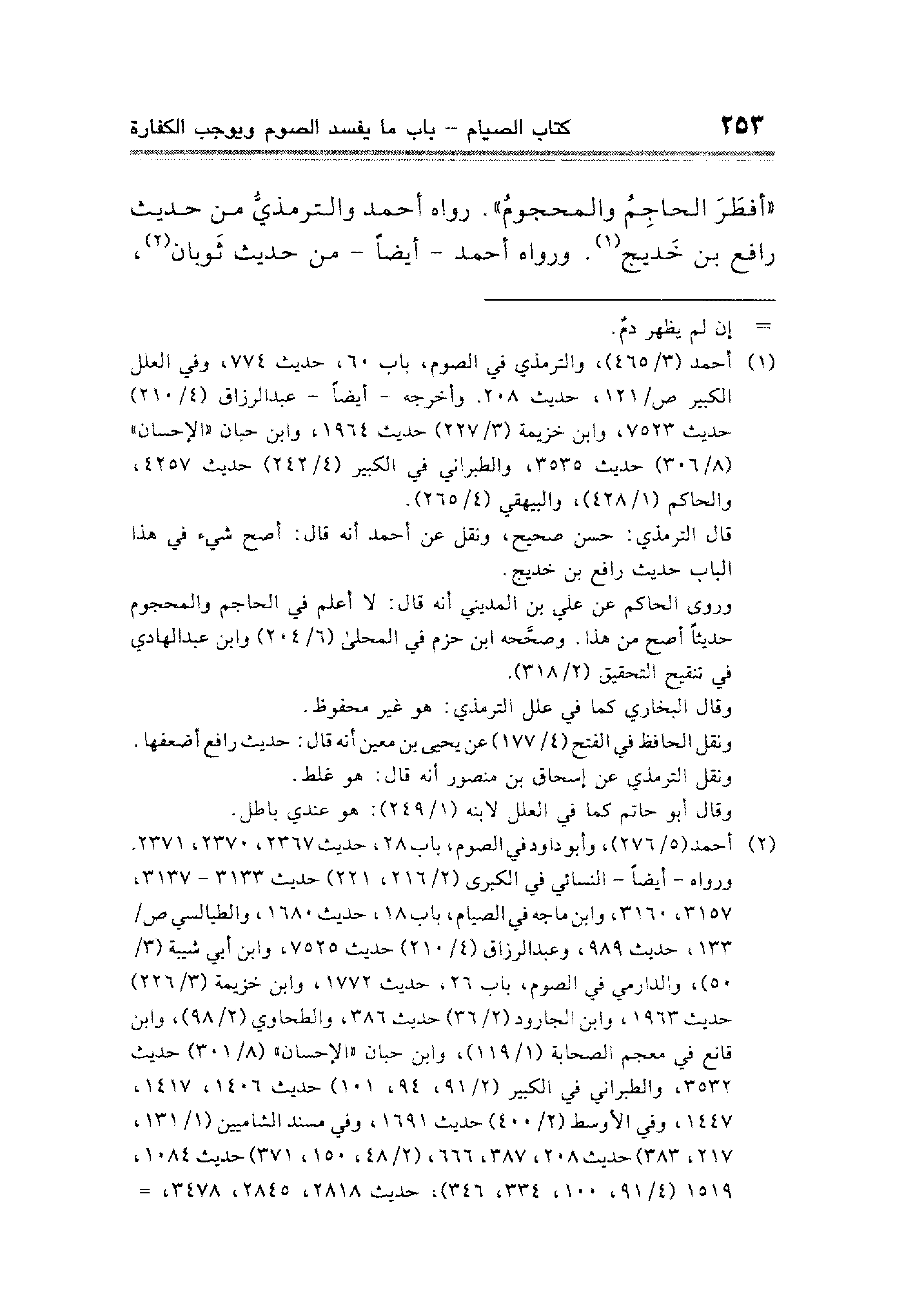 "أفطَرَ الحاجِمُ والمحجومُ". رواه أحمد والترمذي من حديث رافع بن خَديج (¬١). ورواه أحمد -أيضًا- من حديث ثَوبان (¬٢)،