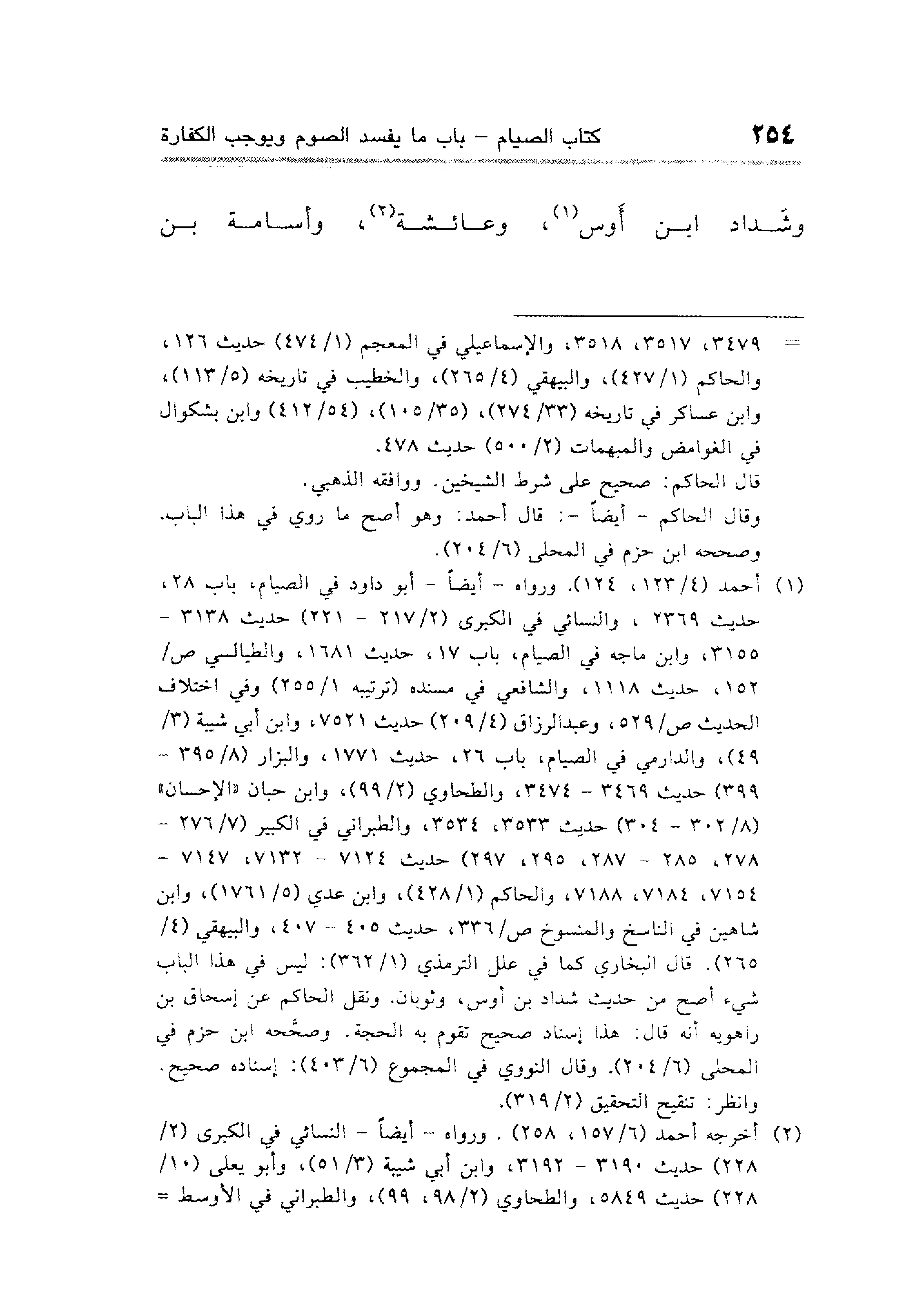(¬١) أحمد (٤/ ١٢٣، ١٢٤). ورواه -أيضًا- أبو داود في الصيام، باب ٢٨، حديث ٢٣٦٩، والنسائي في الكبرى (٢/ ٢١٧ - ٢٢١) حديث ٣١٣٨ - ٣١٥٥، وابن ماجه في الصيام، باب ١٧، حديث ١٦٨١، والطيالسي ص / ١٥٢، حديث ١١١٨، والشافعي في مسنده (ترتيبه ١/ ٢٥٥) وفي اختلاف الحديث ص / ٥٢٩، وعبد الرزاق (٤/ ٢٠٩) حديث ٧٥٢١، وابن أبي شيبة (٣/ ٤٩)، والدارمي في الصيام، باب ٢٦، حديث ١٧٧١، والبزار (٨/ ٣٩٥ - ٣٩٩) حديث ٣٤٦٩ - ٣٤٧٤، والطحاوي (٢/ ٩٩)، وابن حبان "الإحسان" (٨/ ٣٠٢ - ٣٠٤) حديث ٣٥٣٣، ٣٥٣٤، الطبراني في الكبير (٧/ ٢٧٦ - ٢٧٨، ٢٨٥ - ٢٨٧، ٢٩٥، ٢٩٧) حديث ٧١٢٤ - ٧١٣٢، ٧١٤٧ - ٧١٥٤، ٧١٨٤، ٧١٨٨، والحاكم (١/ ٤٢٨)، وابن عدي (٥/ ١٧٦١)، وابن شاهين في الناسخ والمنسوخ ص / ٣٣٦، حديث ٤٠٥ - ٤٠٧، والبيهقي (٤/ ٢٦٥). قال البخاري كما في علل الترمذي (١/ ٣٦٢): ليس في هذا الباب شيء أصح من حديث شداد بن أوس، وثوبان. ونقل الحاكم عن إسحاق بن راهويه أنه قال: هذا إسناد صحيح تقوم به الحجة. وصحَّحه ابن حزم في المحلى (٦/ ٢٠٤). وقال النووي في المجموع (٦/ ٤٥٣): إسناده صحيح. وانظر: تنقيح التحقيق (٢/ ٣١٩).