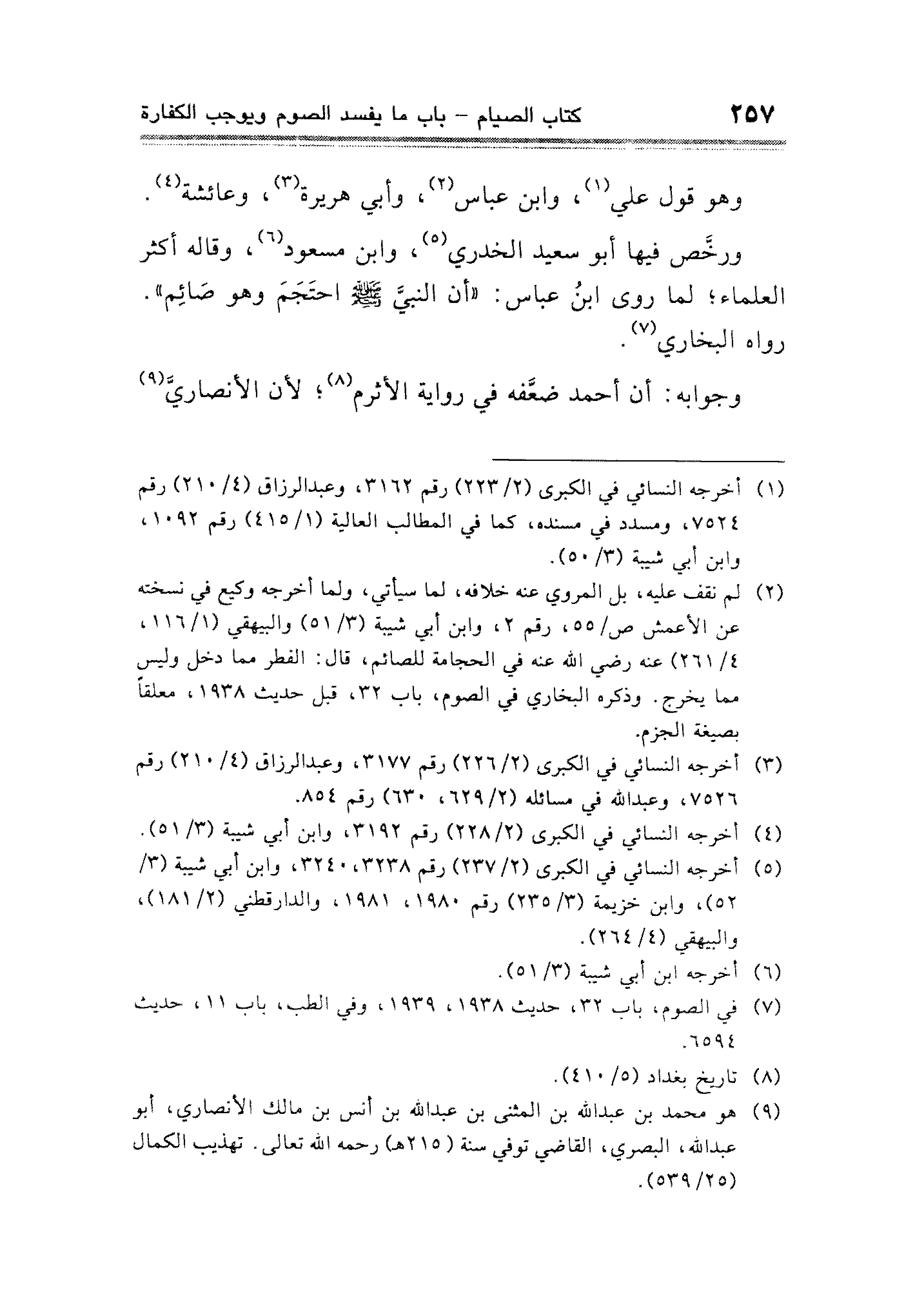 ورخَّص فيها أبو سعيد الخدري (¬٥)، وابن مسعود (¬٦)، وقاله أكثر العلماء؛ لما روى ابنُ عباس: "أن النبي - صلى الله عليه وسلم - احتَجَمَ وهو صَائم".