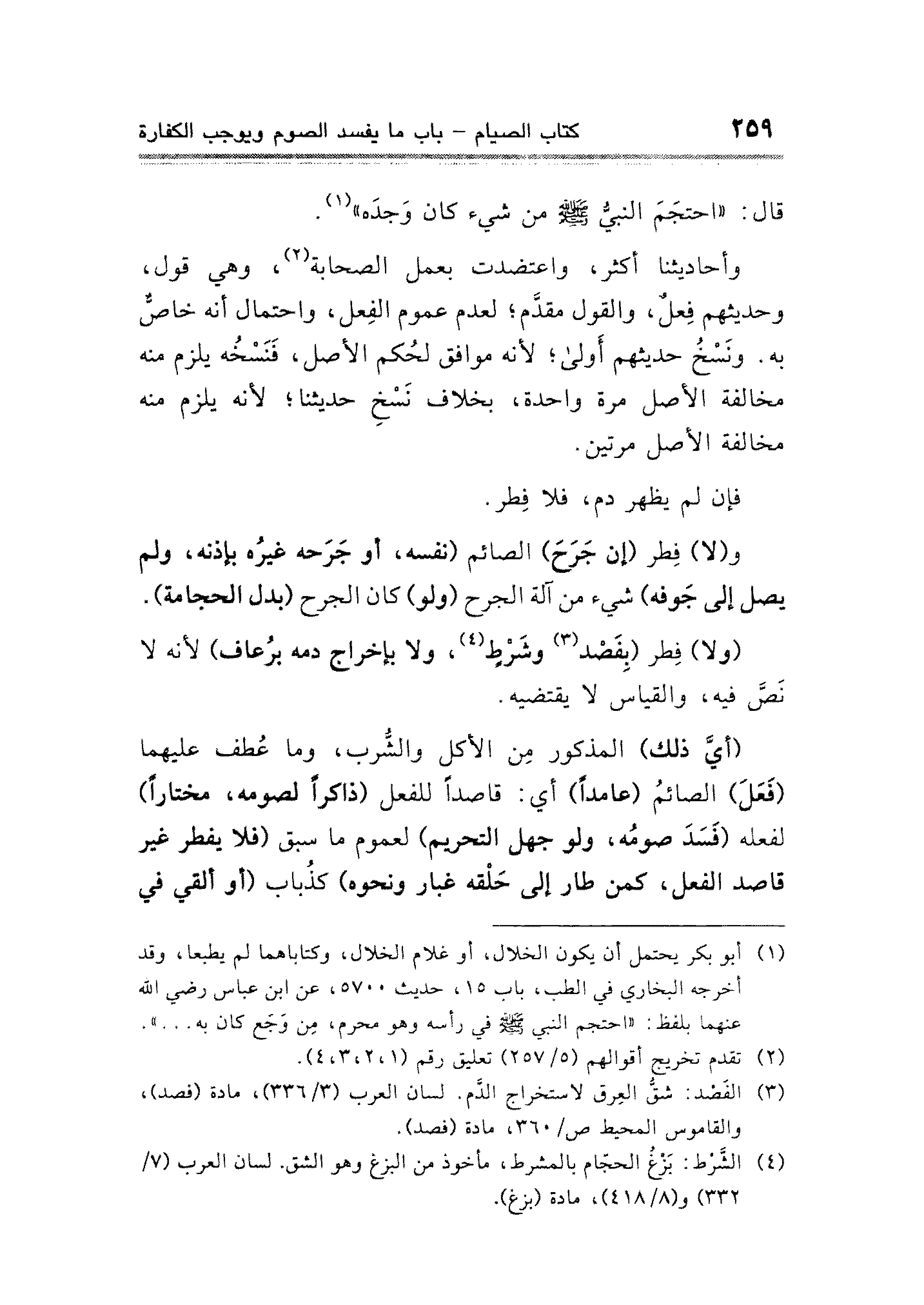(¬٤) الشرط: بَزَغ الحجام بالمشرط، مأخوذ من البزغ وهو الشق. لسان العرب (٧/ ٣٣٢ (و (٨/ ٤١٨)، مادة (بزغ).