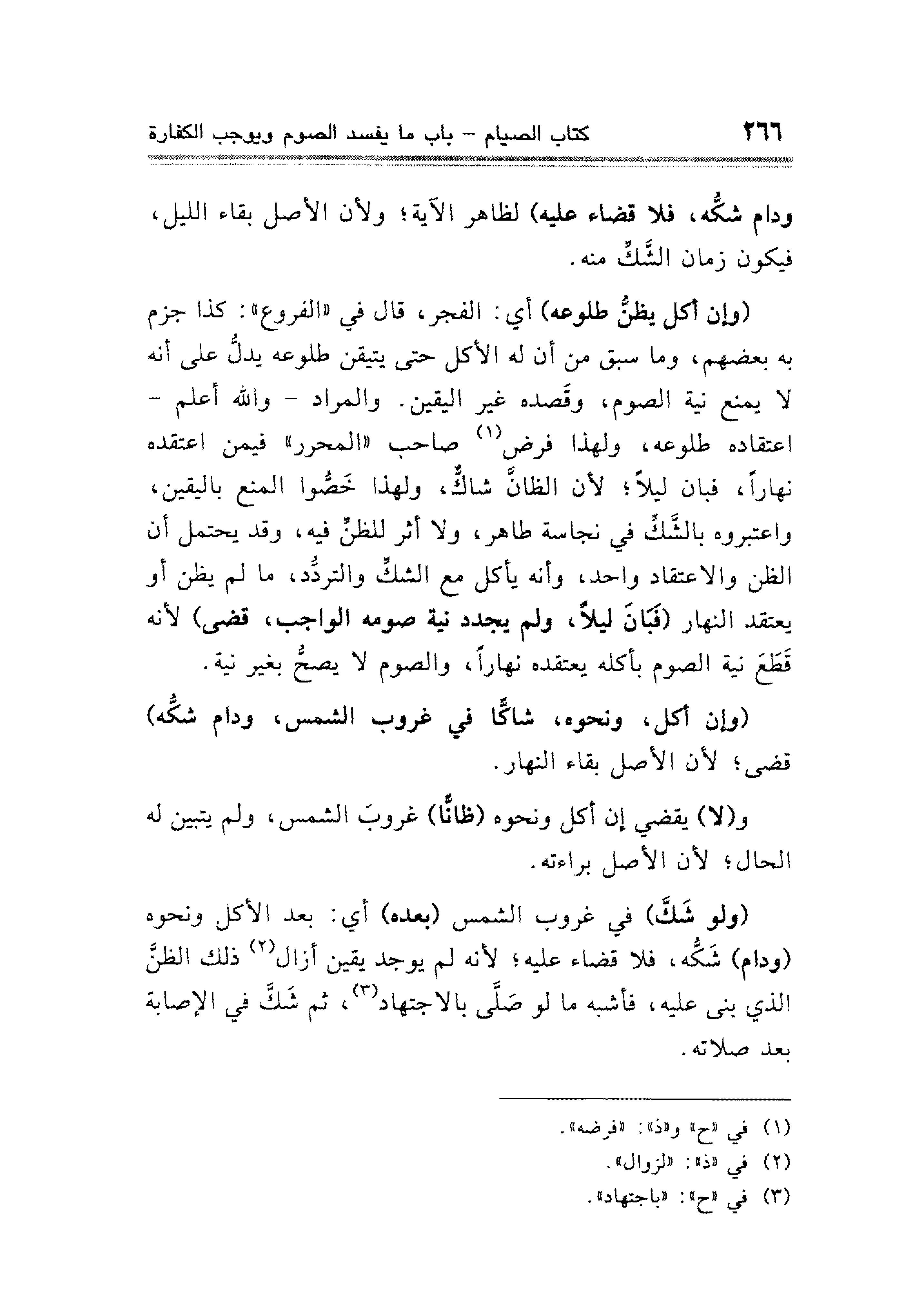 (ولو شَكَّ) في غروب الشمس (بعده) أي: بعد الأكل ونحوه (ودام) شَكُّه، فلا قضاه عليه؛ لأنه لم يوجد يقين أزال (¬٢) ذلك الظنَّ الذي بنى عليه، فأشبه ما لو صَلَّى بالاجتهاد (¬٣)، ثم شَكَّ في الإصابة بعد صلاته.