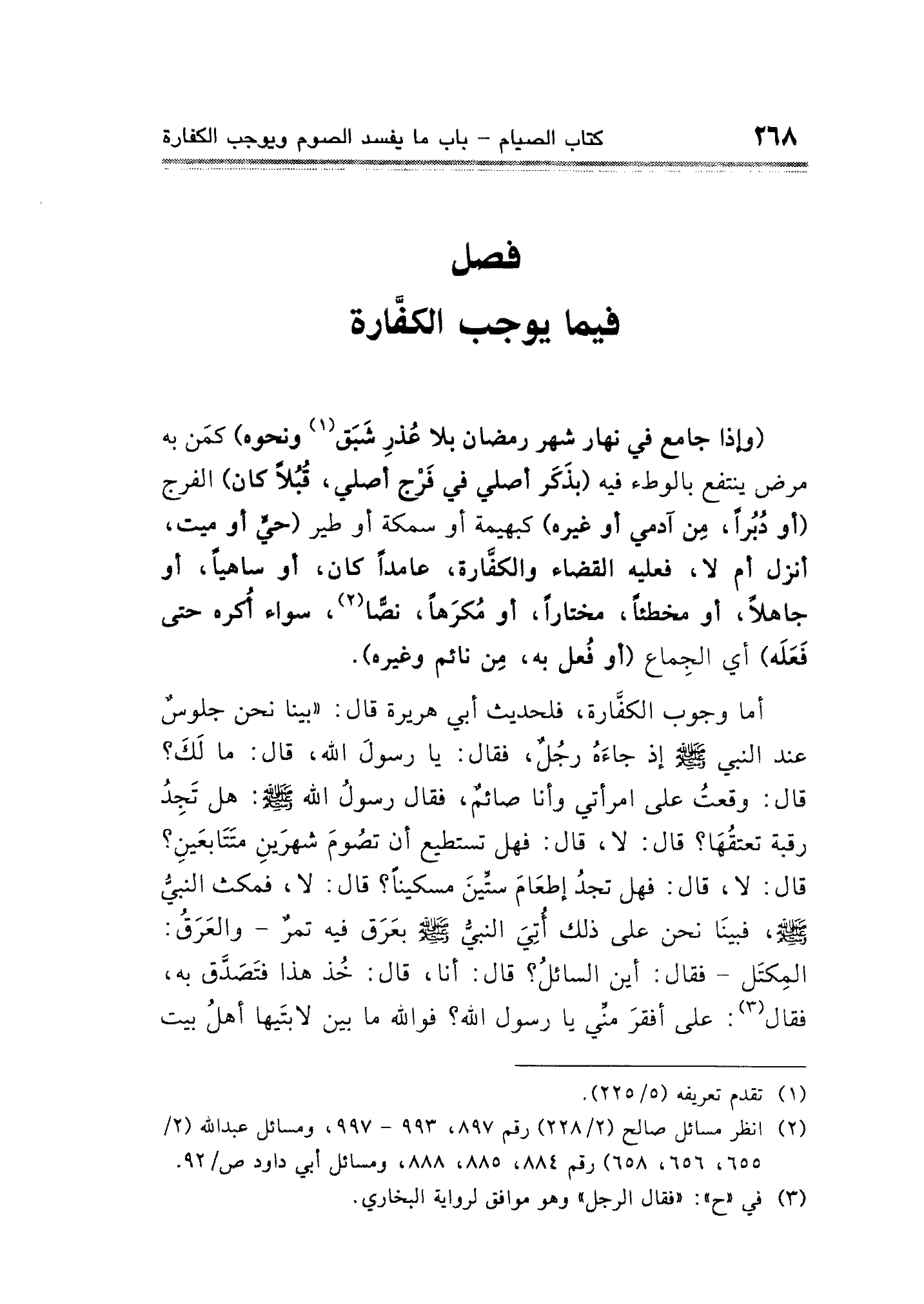 أما وجوب الكفَّارة، فلحديث أبي هريرة قال: "بينا نحن جلوسٌ عند النبي - صلى الله عليه وسلم - إذ جاءَهُ رجُلٌ، فقال: يا رسولَ الله، قال: ما لَكَ؟ قال: وقعتُ على امرأتي وأنا صائمٌ، فقال رسولُ الله - صلى الله عليه وسلم -: هل تَجِدُ رقبة تعتقُهَا؟ قال: لا، قال: فهل تستطيع أن تصُومَ شهرَينِ متَتَابعَينِ؟ قال: لا، قال: فهل تجدُ إطعَامَ ستِّينَ مسكينًا؟ قال: لا، فمكث النبيُّ - صلى الله عليه وسلم -، فبينَا نحن على ذلك أُتِيَ النبيُّ - صلى الله عليه وسلم - بعَرَق فيه تمرٌ -والعَرَقُ: المِكتَلَ- فقال: أين السائلُ؟ قال: أنا، قال: خُذ هذا فتَصَدَّق به، فقال (¬٣): على أفقرَ منِّي يا رسول الله؟ فوالله ما بين لابتَيها أهلُ بيت