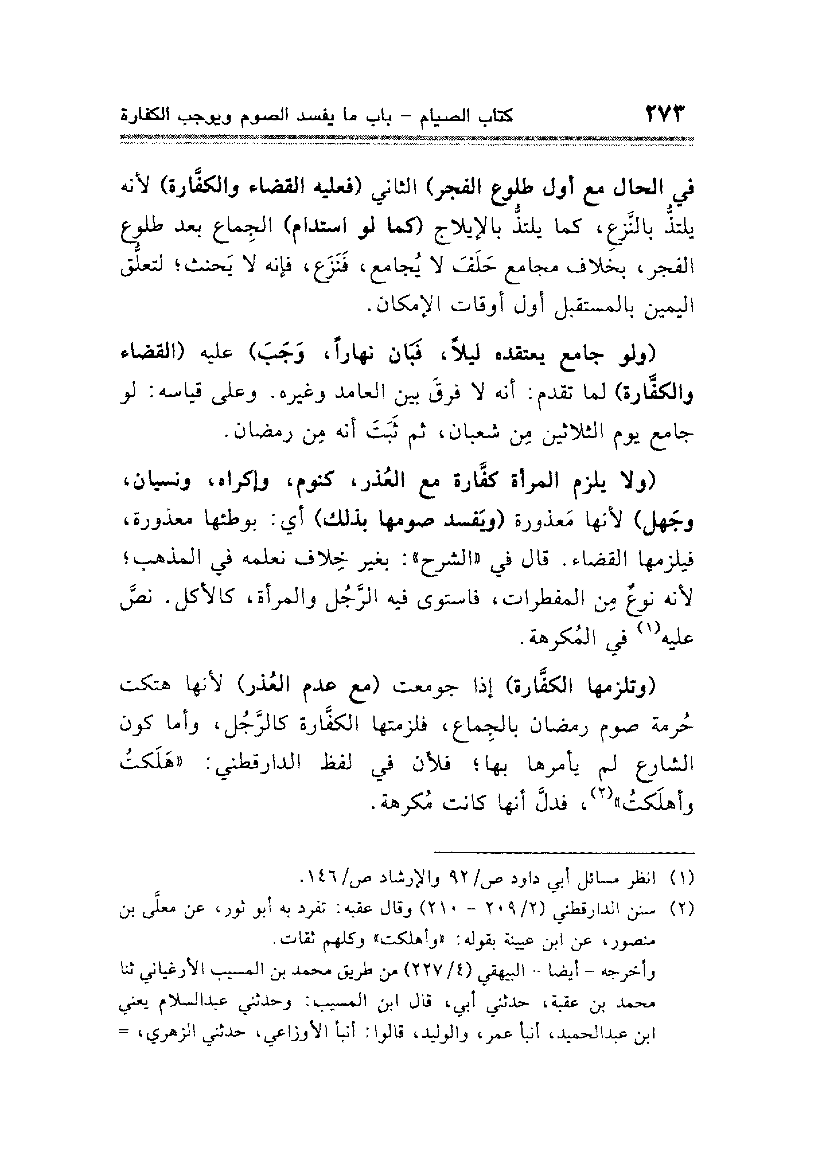(وتلزمها الكفارة) إذا جومعت (مع عدم العُذر) لأنها هتكت حُرمة صوم رمضان بالجماع، فلزمتها الكفارة كالرجُل، وأما كون الشارع لم يأمرها بها؛ فلأن في لفظ الدارقطني: "هَلَكتُ وأهلَكت" (¬٢)، فدلَّ أنها كانت مُكرهة.