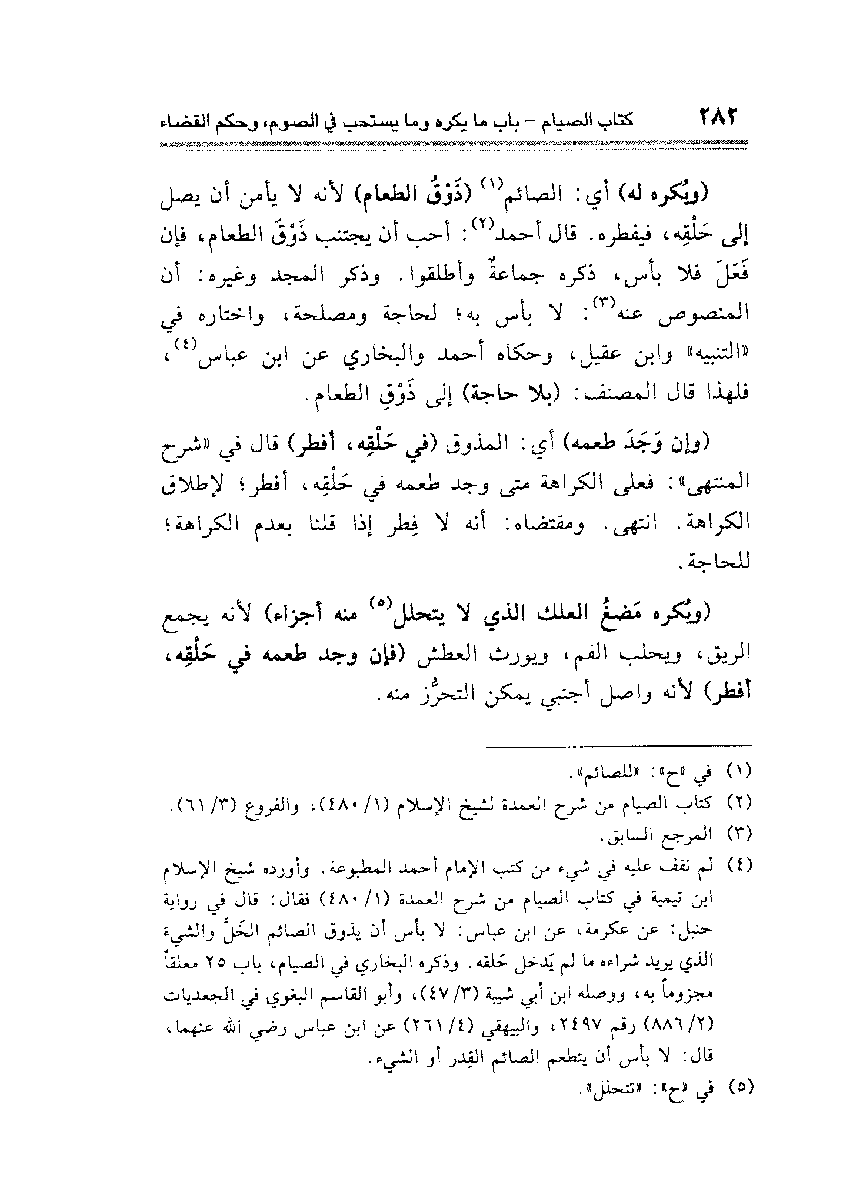 (ويُكره له) أي: الصائم (¬١) (ذَوْقُ الطعام) لأنه لا يأمن أن يصل إلى حَلْقِه، فيفطره. قال أحمد (¬٢): أحب أن يجتنب ذَوْقَ الطعام، فإن فَعَلَ فلا بأس، ذكره جماعةٌ وأطلقوا. وذكر المجد وغيره: أن المنصوص عنه (¬٣): لا بأس به؛ لحاجة ومصلحة، واختاره في "التنبيه" وابن عقيل، وحكاه أحمد والبخاري عن ابن عباس (¬٤)، فلهذا قال المصنف: (بلا حاجة) إلى ذَوقِ الطعام.