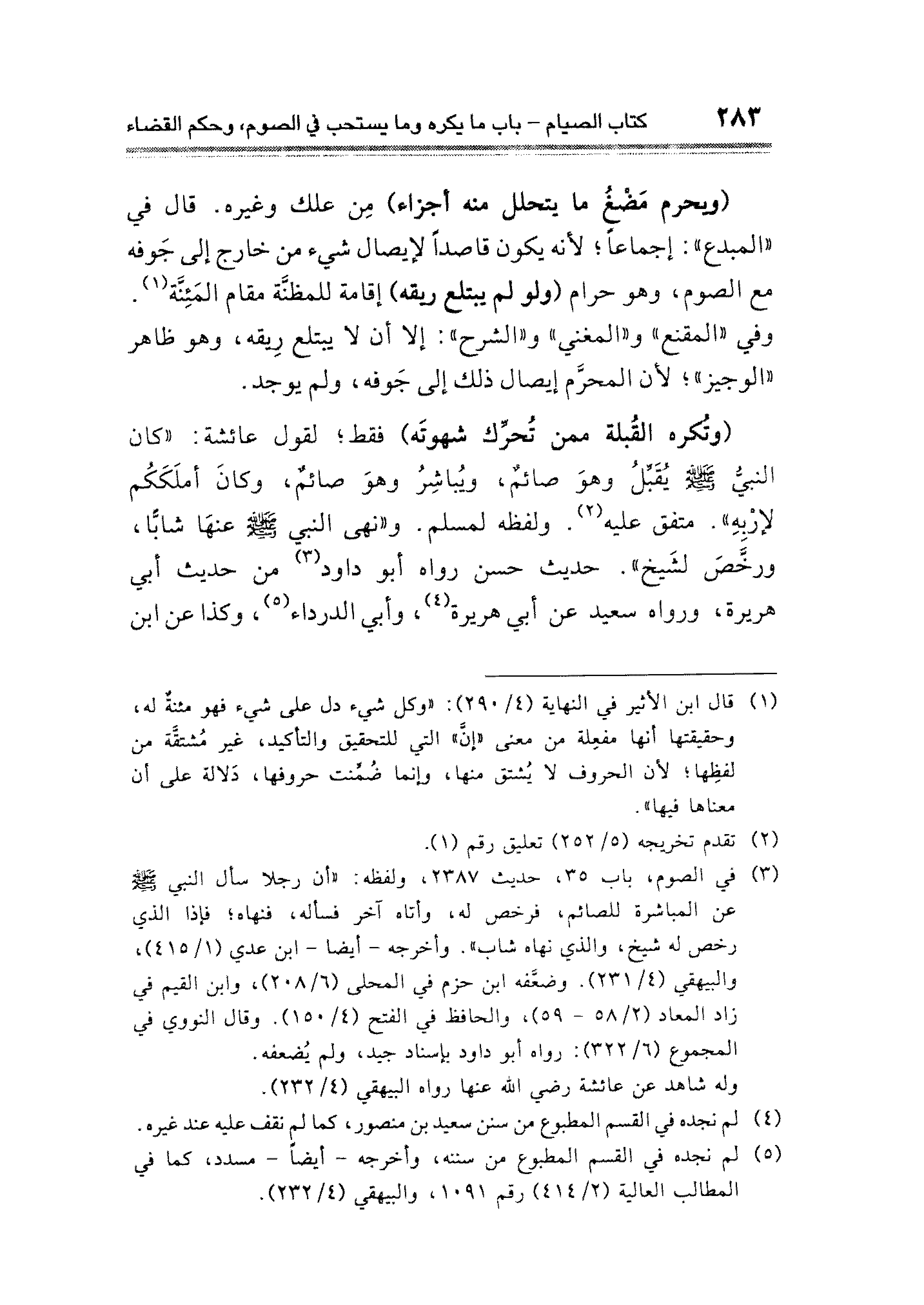 (ويحرم مَضْغ ما يتحلل مثله أجزاء) مِن علك وغيره. قال في "المبدع": إجماعًا؛ لأنه يكون قاصدًا لإيصال شيء من خارج إلى جَوفه مع الصوم، وهو حرام (ولو لم يبتلع ريقه) إقامة للمظنَّة مقام المَئِنَّة (¬١).