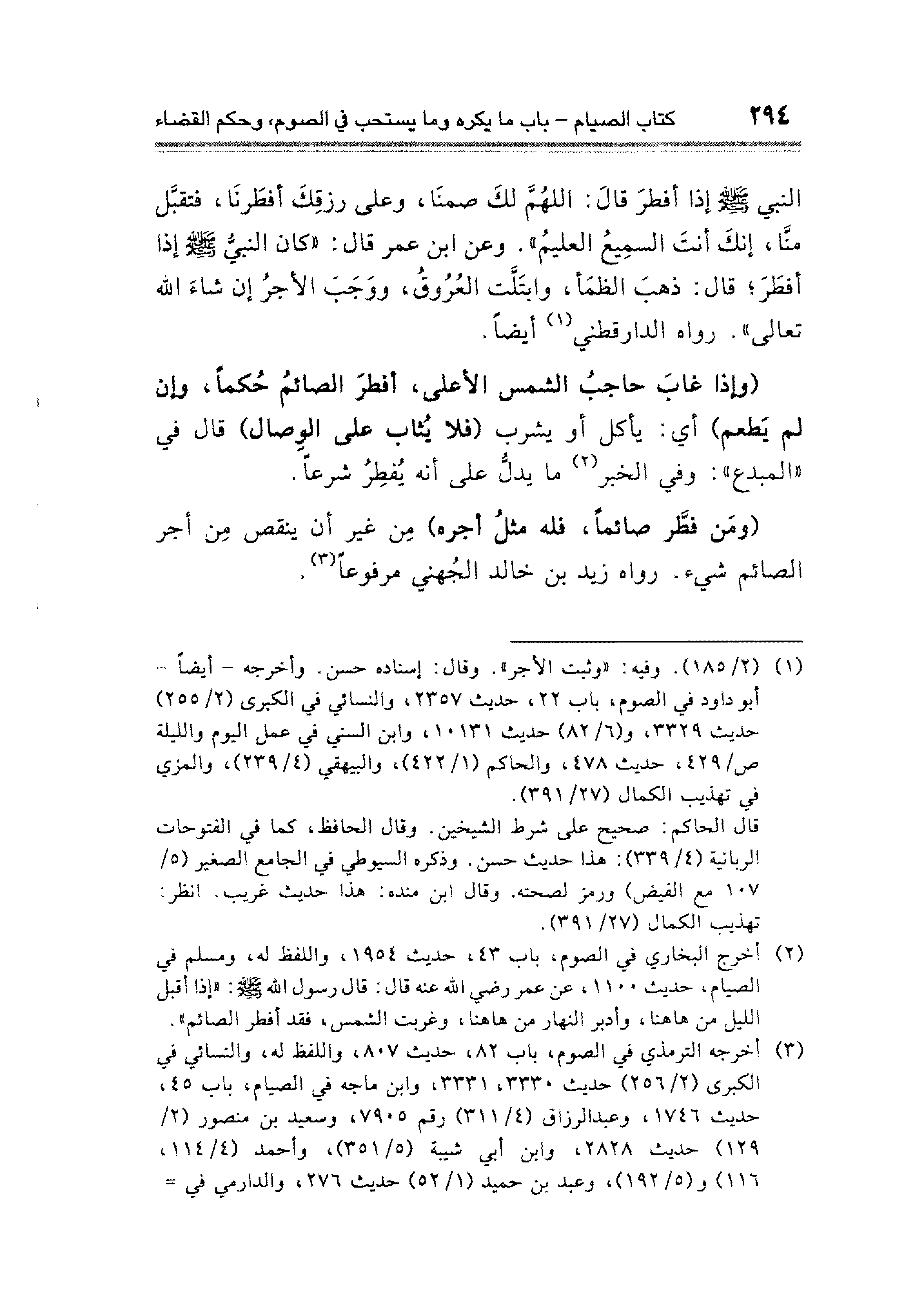 النبي - صلى الله عليه وسلم - إذا أفطرَ قالَ: اللهمَّ لكَ صمنَا، وعلى رزقِكَ أفطَرنَا، فتقبَّل منَّا، إنكَ أنتَ السمِيعُ العليمُ". وعن ابن عمر قال: "كان النَّبيُّ - صلى الله عليه وسلم - إذا أفطَرَ؛ قال: ذهبَ الظمَأ، وابتَلَّت العُرُوقُ، ووَجَبَ الأجرُ إن شاءَ الله تعالى". رواه الدارقطني (¬١) أيضًا.