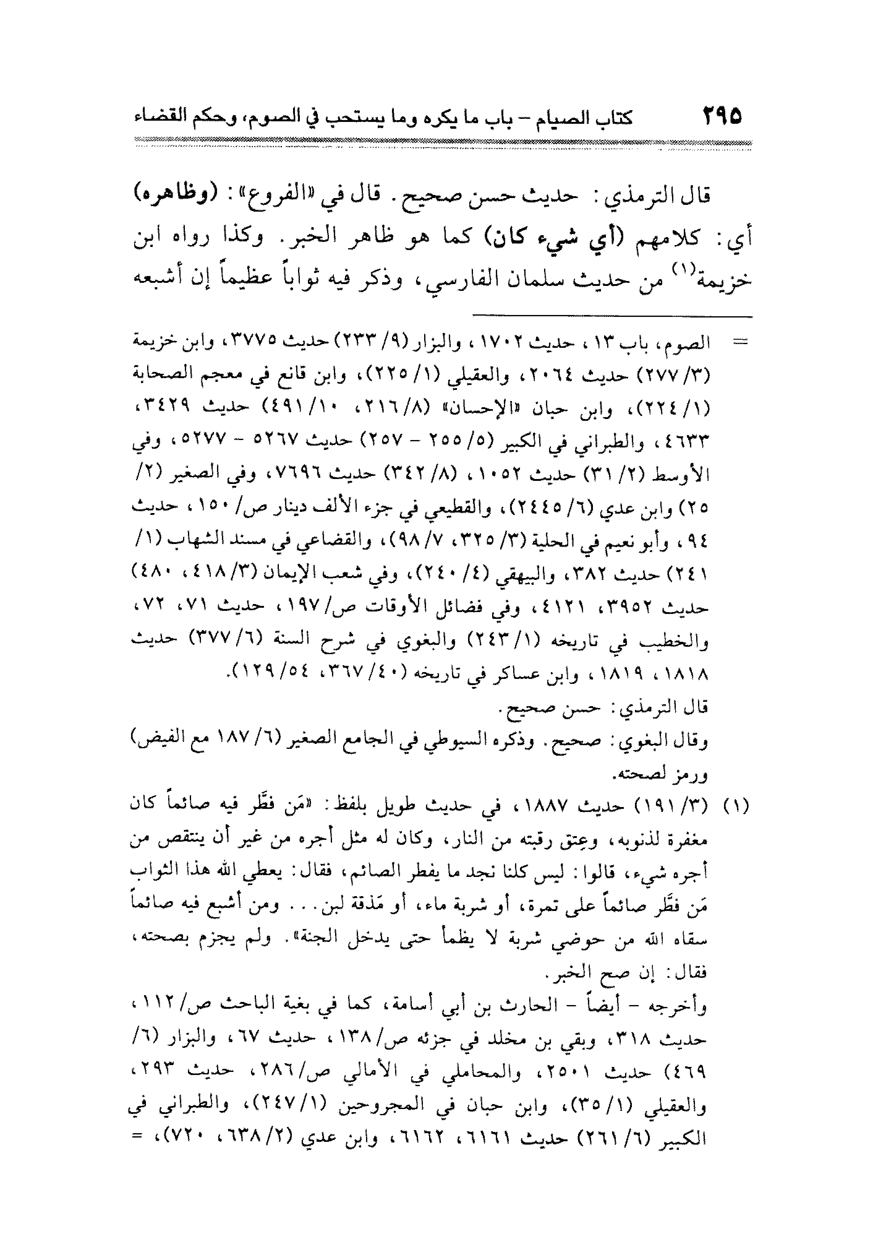 قال الترمذي: حديث حسن صحيح. قال في "الفروع": (وظاهره) أي: كلامهم (أي شيء كان) كما هو ظاهر الخبر. وكذا رواه ابن خزيمة (¬١) من حديث سلمان الفارسي، وذكر فيه ثوابًا عظيمًا إن أشبعه