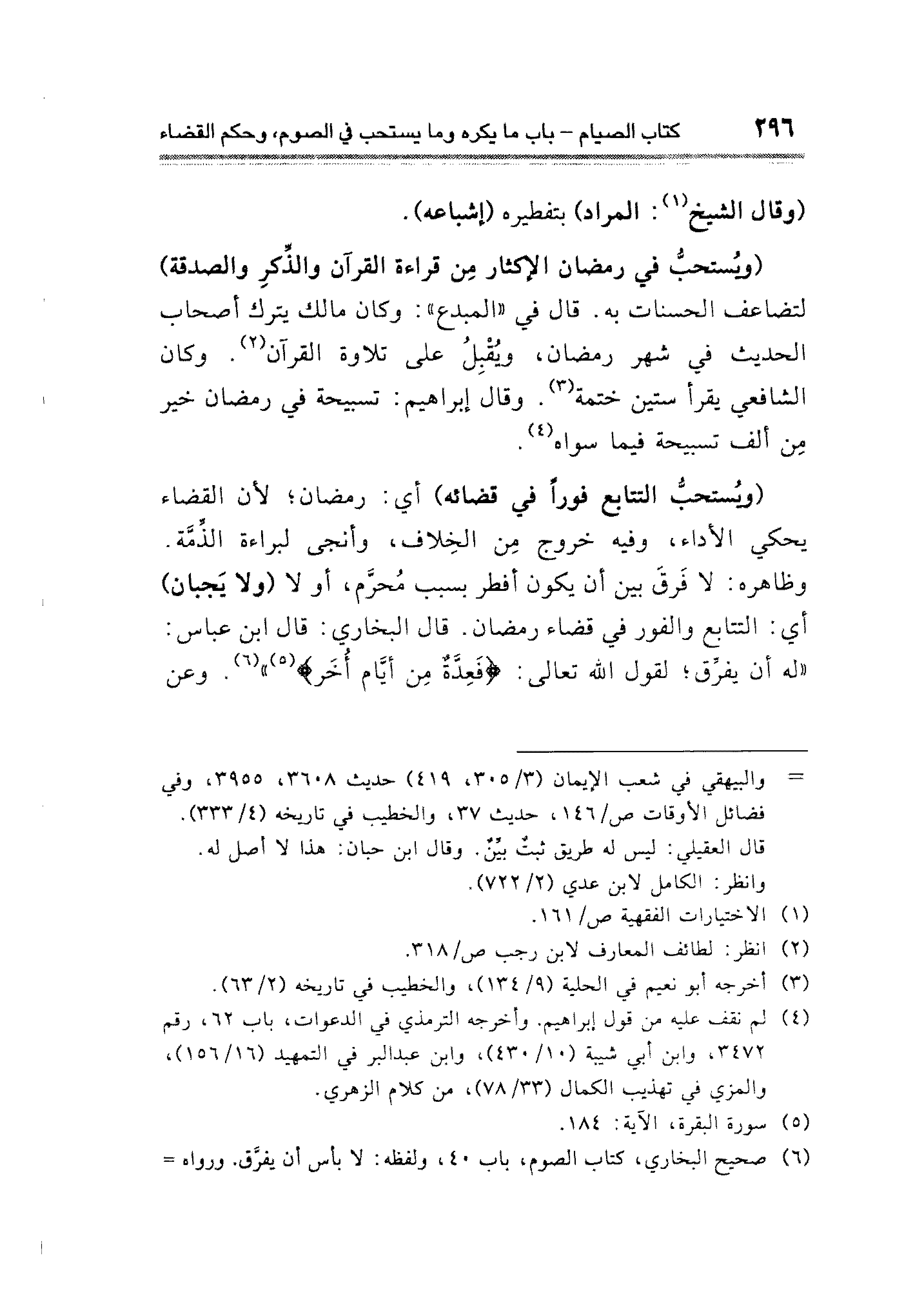 (ويُستحبُّ التتابع فورًا في قضائه) أي: رمضان؛ لأن القضاء يحكي الأداء، وفيه خروج مِن الخِلاف، وأنجى لبراءة الذِّمَّة. وظاهره: لا فَرقَ بين أن يكون أفطر بسبب مُحرَّم، أو لا (ولا يَجبان) أي: التتابع والفور في قضاء رمضان. قال البخاري: قال ابن عباس: "له أن يفرِّق؛ لقول الله تعالى: {فَعِدَّةٌ مِنْ أَيَّامٍ أُخَرَ} (¬٥) " (¬٦). وعن