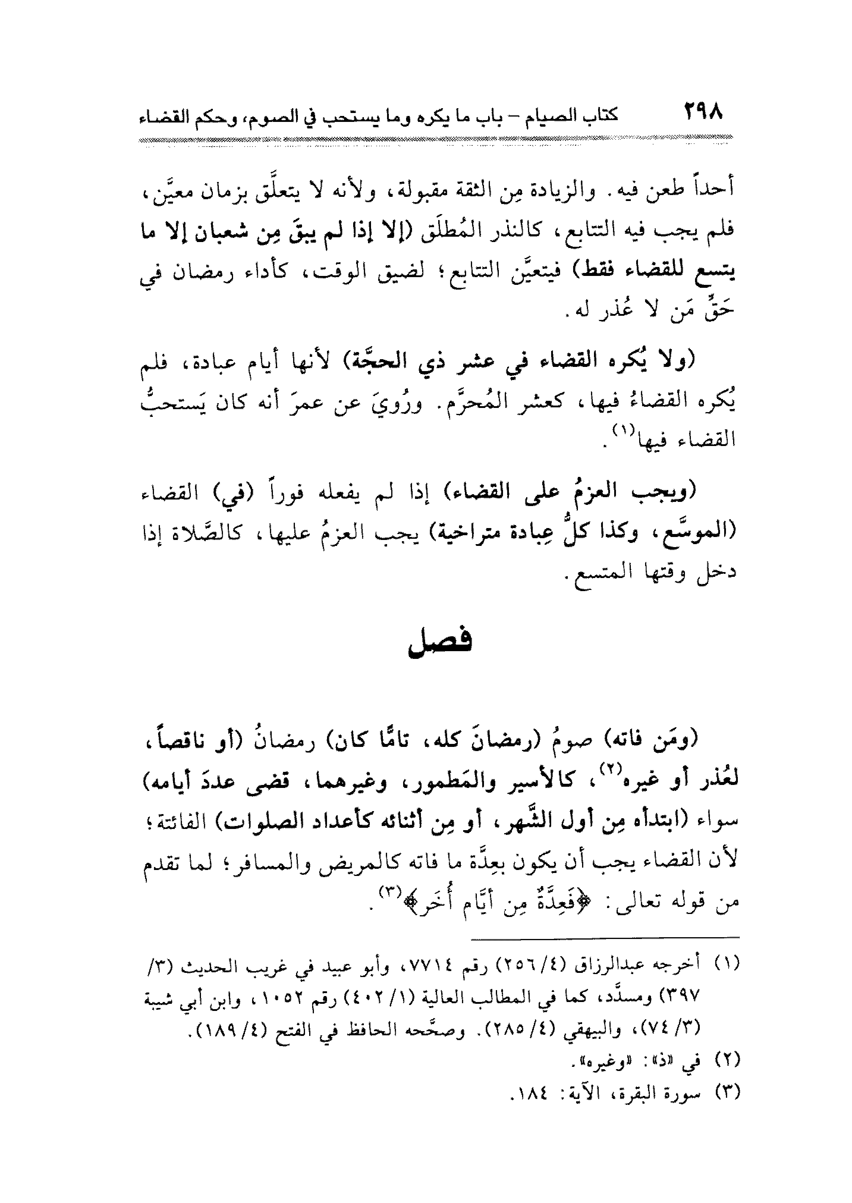 (ولا يُكره القضاء في عشر ذي الحجَّة) لأنها أيام عبادة، فلم يُكره القضاءُ فيها، كعشر المُحرَّم. ورُويَ عن عمرَ أنه كان يَستحبُّ القضاء فيها (¬١).