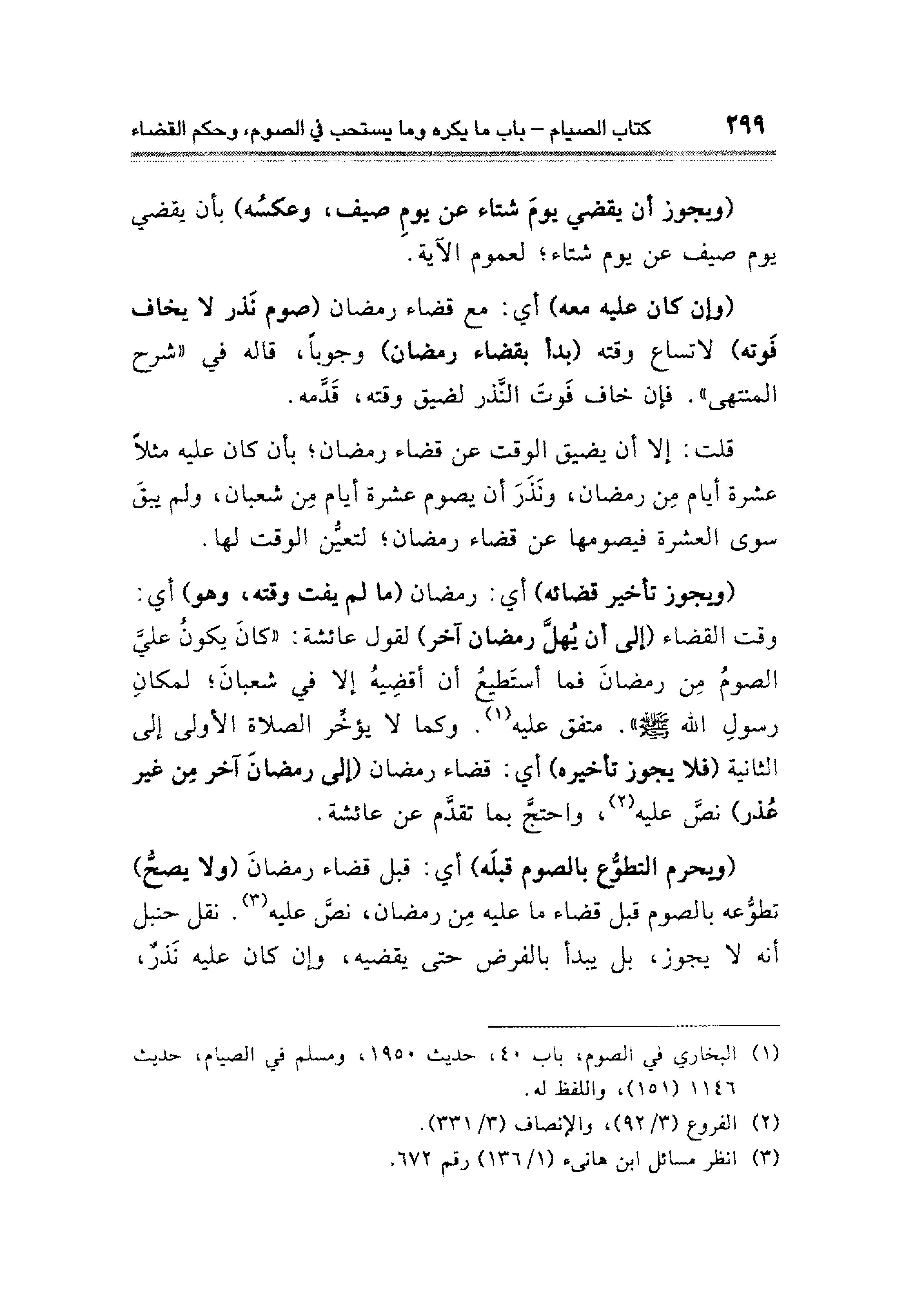 (ويحرم التطوُّع بالصوم قبلَه) أي: قبل قضاء رمضانَ (ولا يصحُّ) تطوُّعه بالصوم قبل قضاء ما عليه مِن رمضان، نصَّ عليه (¬٣). نقل حنبل أنه لا يجوز، بل يبدأ بالفرض حتى يقضيه، وإن كان عليه نَذرٌ،