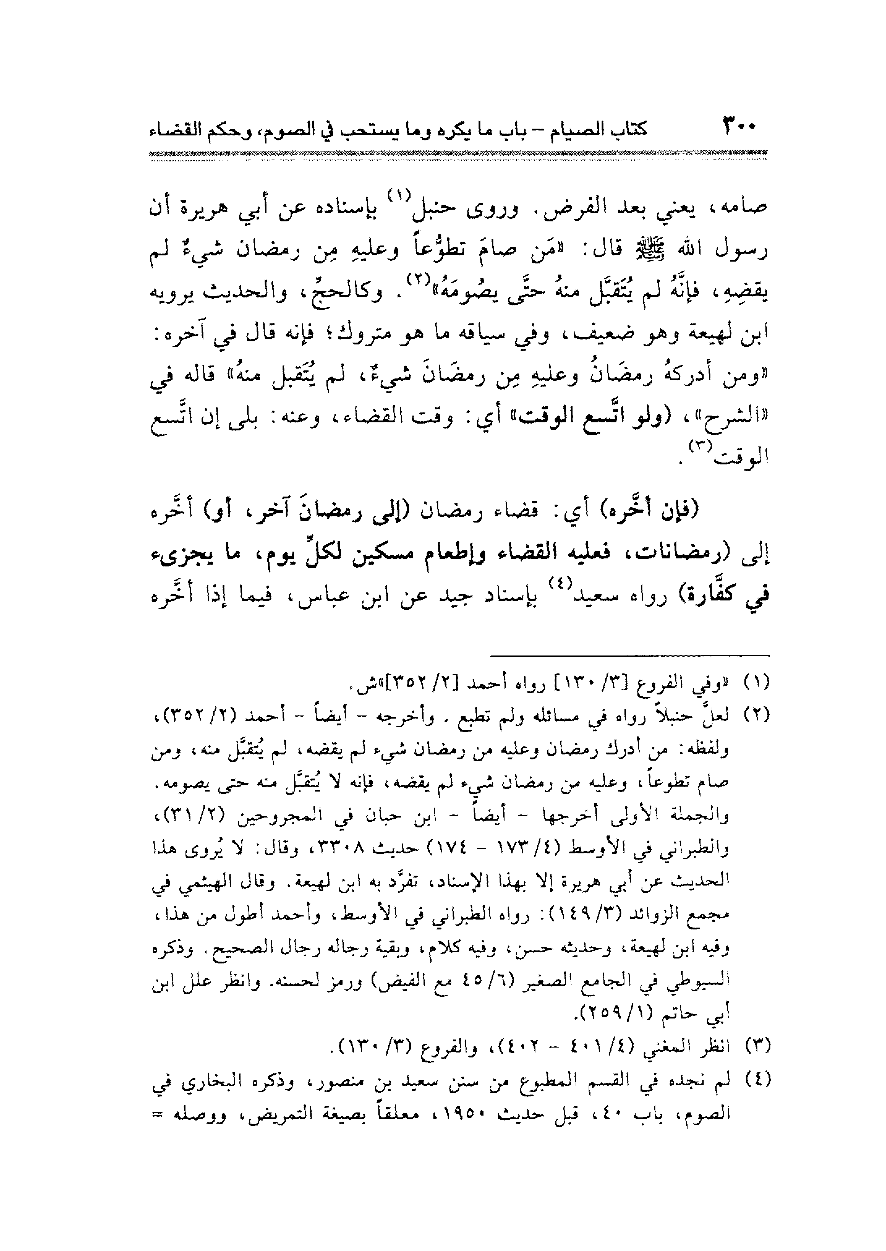 (¬٢) لعلَّ حبلًا رواه في مسائله ولم تطبع. وأخرجه -أيضًا- أحمد (٢/ ٣٥٢)، ولفظه: من أدرك رمضان وعليه من رمضان شيء لم يقضه، لم يُتقبَّل منه، ومن صام تطوعًا، وعليه من رمضان شيء لم يقضه، فإنه لا يُتقبَّل منه حتى يصومه. والجملة الأولى أخرجها -أيضًا- ابن حبان في المجروحين (٢/ ٣١)، والطبراني في الأوسط (٤/ ١٧٣ - ١٧٤) حديث ٣٣٠٨، وقال: لا يُروى هذا الحديث عن أبي هريرة إلا بهذا الإسناد، تفرَّد به ابن لهيعة. وقال الهيثمي في مجمع الزوائد (٣/ ١٤٩): رواه الطبراني في الأوسط، وأحمد أطول من هذا، وفيه ابن لهيعة، وحديثه حسن، وفيه كلام، وبقية رجاله رجال الصحيح. وذكره السيوطي في الجامع الصغير (٦/ ٤٥ مع الفيض) ورمز لحسنة. وانظر علل ابن أبي حاتم (١/ ٢٥٩).