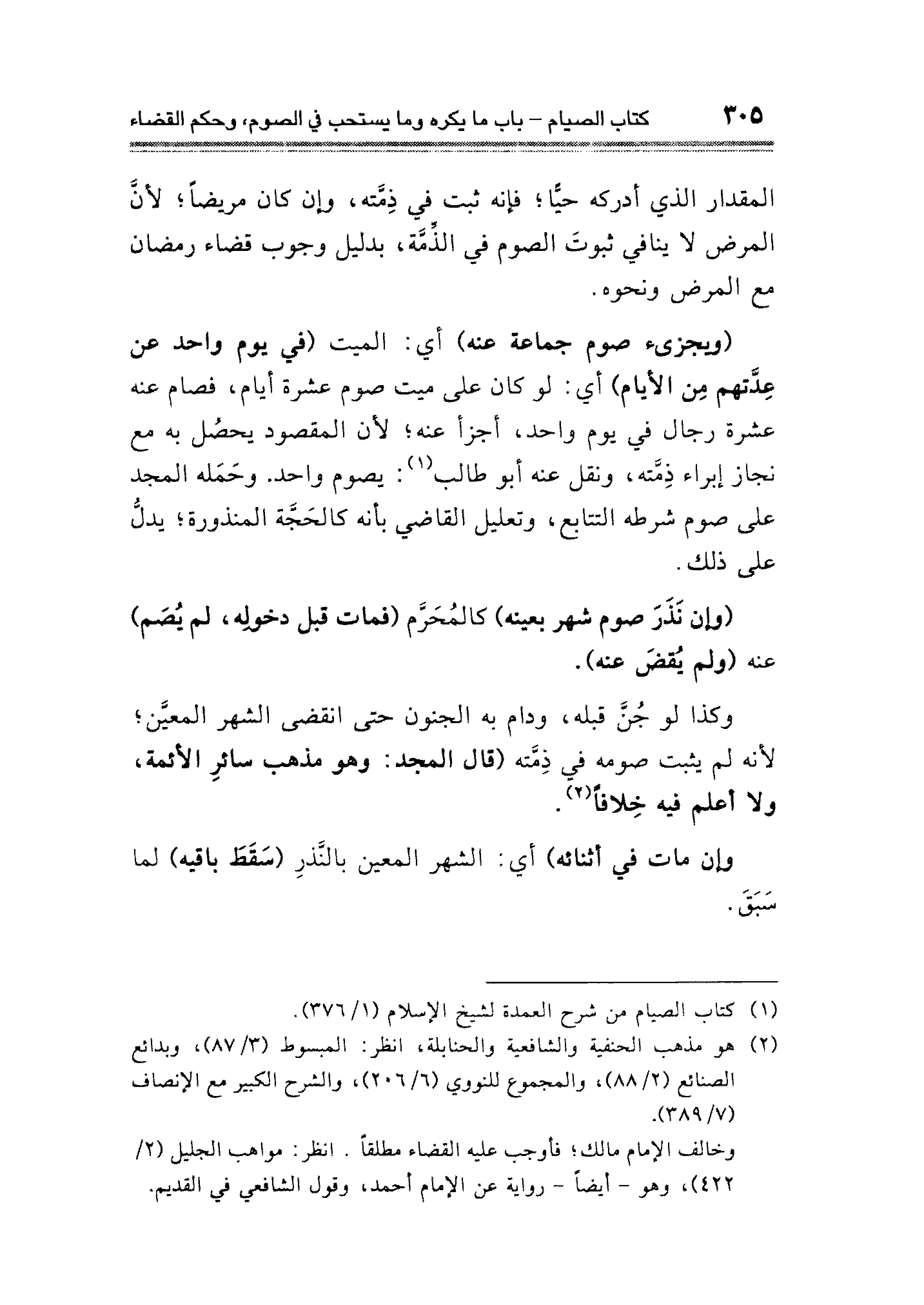 وكذا لو جُنَّ قبله، ودام به الجنون حتى انقضى الشهر المعيَّن؛ لأنه لم يثبت صومه في ذِمَّته (قال المجد: وهو مذهب سائرِ الأئمة، ولا أعلم فيه خِلافًا) (¬٢).