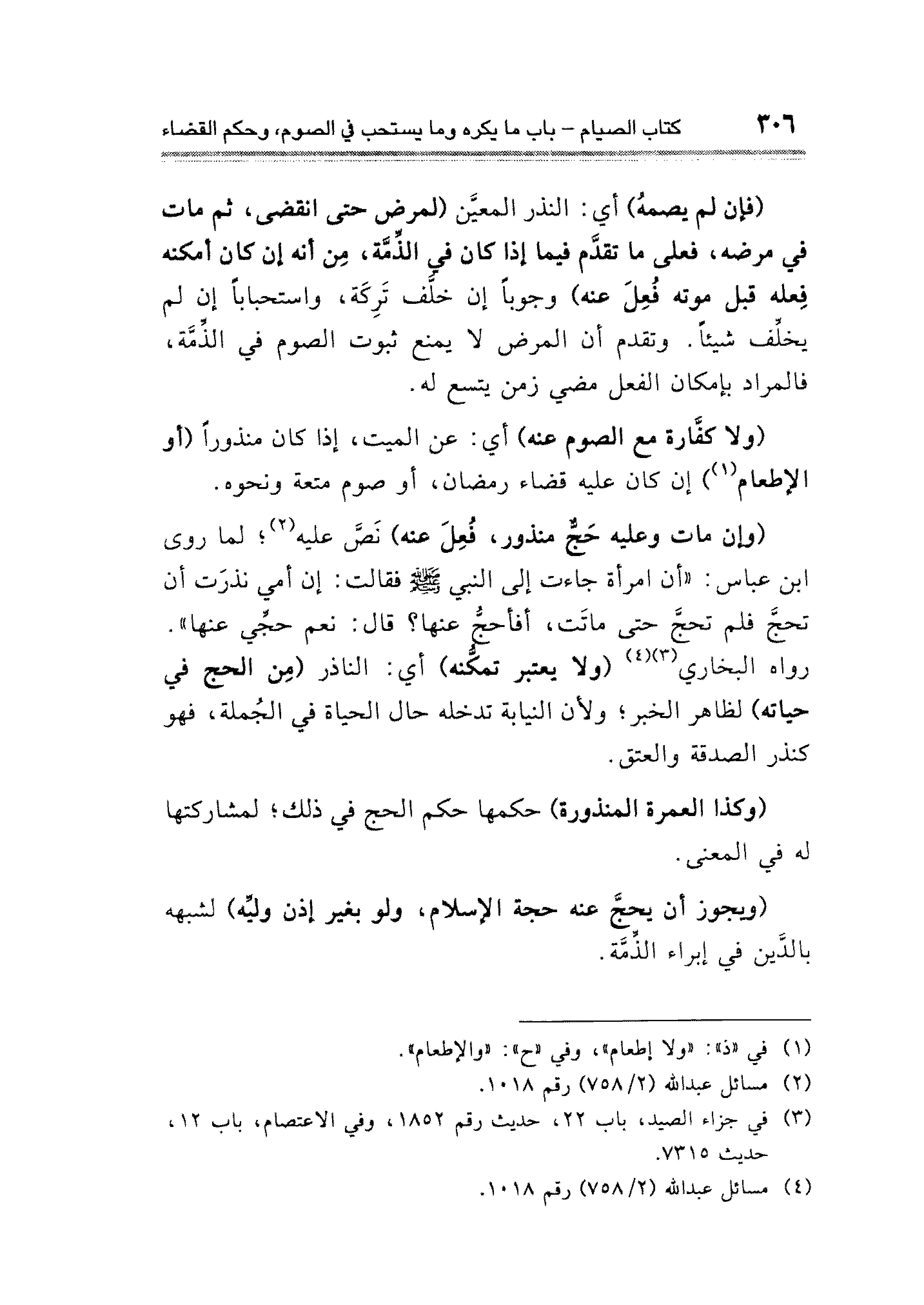 (وإن مات وعليه حَجٌّ منذور، فُعِلَ عنه) نَصَّ عليه (¬٢)، لما روى ابن عباس: "أن امرأة جاءت إلى النبي - صلى الله عليه وسلم - فقالت: إن أمي نذرَت أن تحجَّ فلم تحجَّ حتى ماتَت، أفأحجُّ عنها؟ قال: نعم حجِّي عنها". رواه البخاري (¬٣) (¬٤) (ولا يعتبر تمكُّنه) أي: الناذر (مِن الحج في حياته) لظاهر الخبر، ولأن النياية تدخله حال الحياة في الجُملة، فهو كنذر الصدقة والعتق.