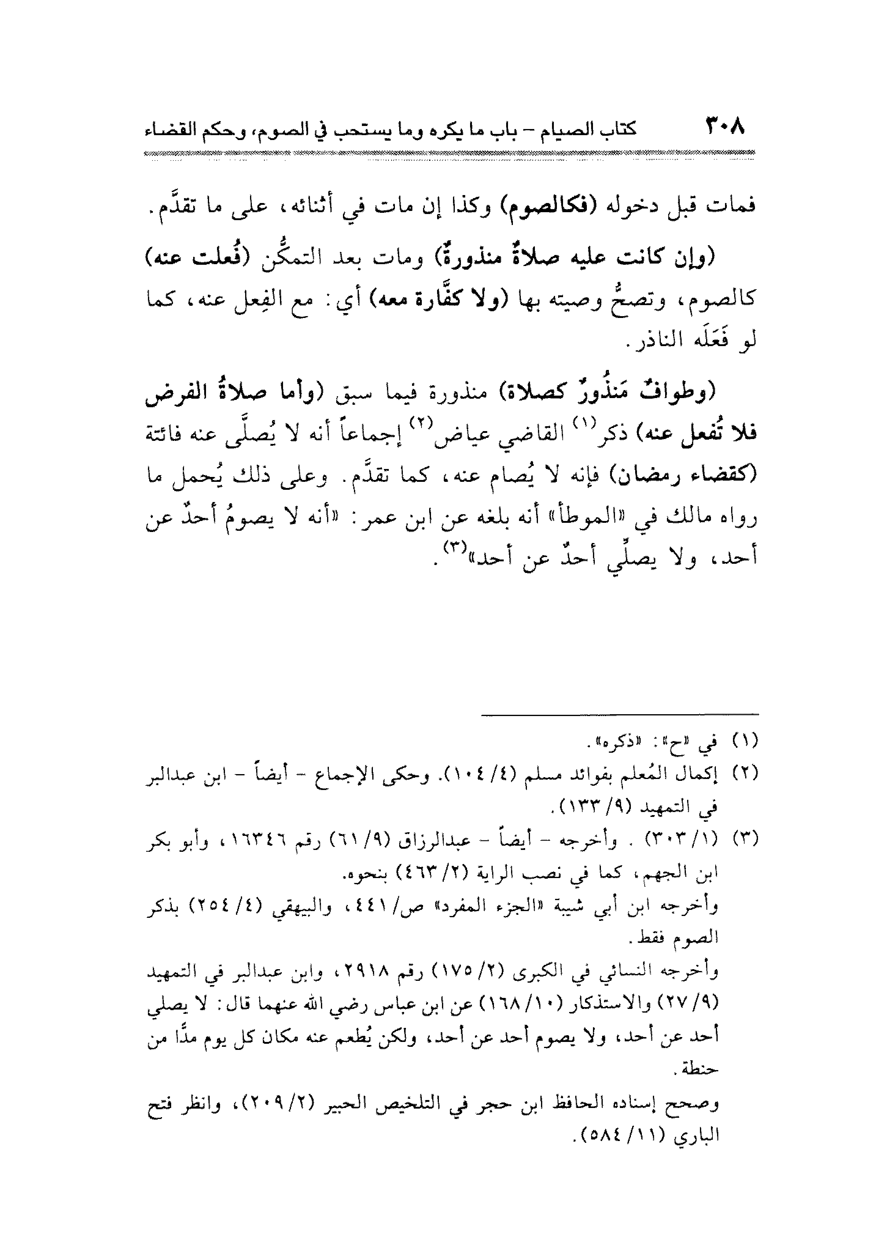 (وطوافٌ مَنذُورٌ كصلاة) منذورة فيما سبق (وأما صلاةُ الفرض فلا تُفعل عنده) ذكر (¬١) القاضي عياض (¬٢) إجماعًا أنه لا يُصلَّى عنه فائتة (كقضاء رمضان) فإنه لا يُصام عنه، كما تقدَّم. وعلى ذلك يُحمل ما رواه مالك في "الموطأ" أنه بلغه عن ابن عمر: "أنه لا يصومُ أحدٌ عن أحد، ولا يصلِّي أحدٌ عن أحد" (¬٣).