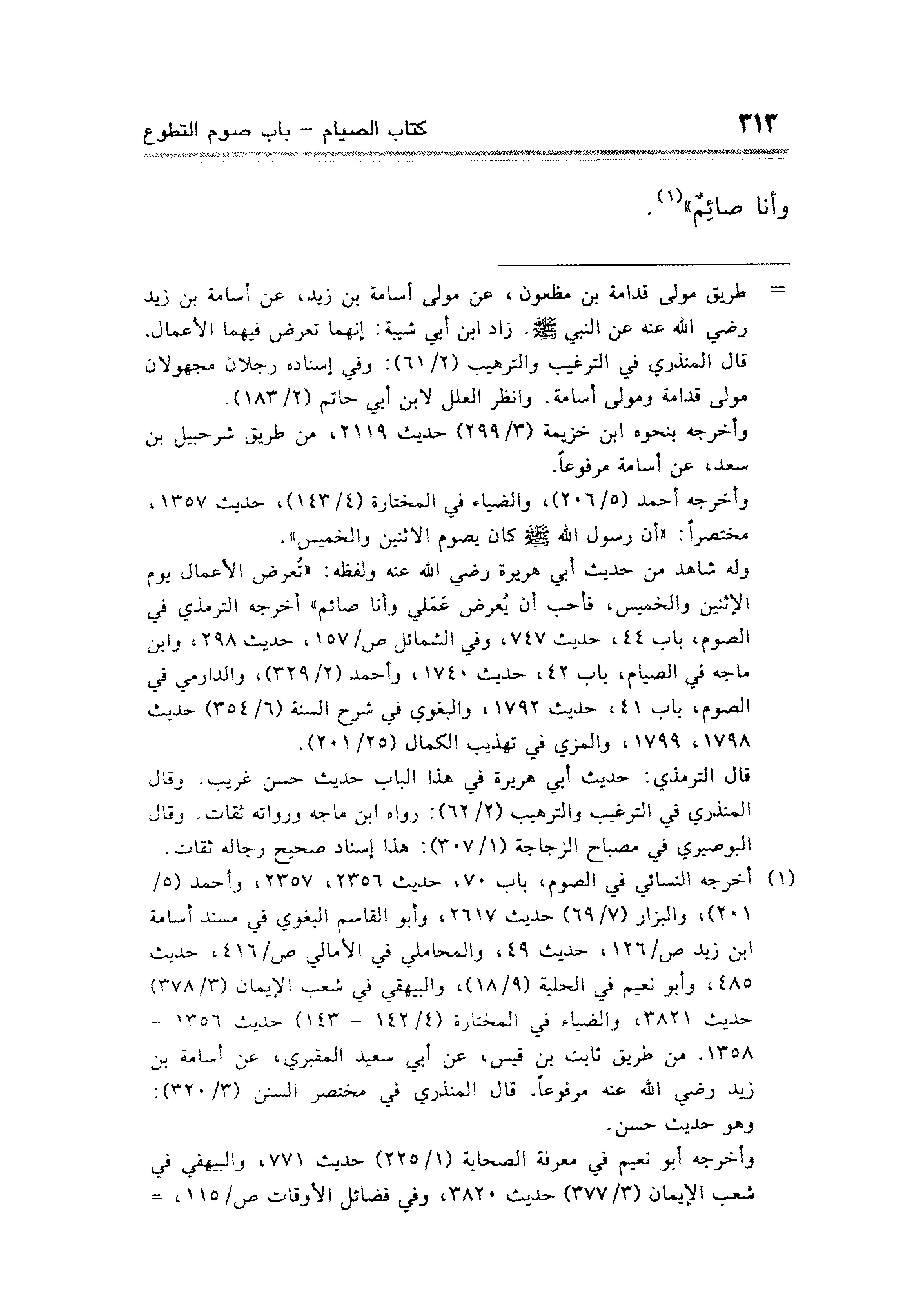 (¬١) أخرجه النسائي في الصوم، باب ٧٠، حديث ٢٣٥٦، ٢٣٥٧، وأحمد (٥ / (٢٠١)، والبزار (٧/ ٦٩) حديث ٢٦٧١، وأبو القاسم البغوي في عند أسامة بن زيد ص / ١٢٦، حديث ٤٩، والمحاملي في الأمالي ص / ٤١٦، حديث ٤٨٥، وأبو نعيم في الحلية (٩/ ١٨)، والبيهقي في شعب الإيمان (٣/ ٣٧٨) حديث ٣٨٢١، والضياء في المختارة (٤/ ١٤٢ - ١٤٣) حديث ١٣٥٦ - ١٣٥٨ - من طريق ثابت بن قيس، عن أبي سعيد المقبري، عن أسامة بن زيد رضي الله عنه مرفوعًا. قال المنذري في مختصر السنن (٣/ ٣٢٠): وهو حديث حسن.