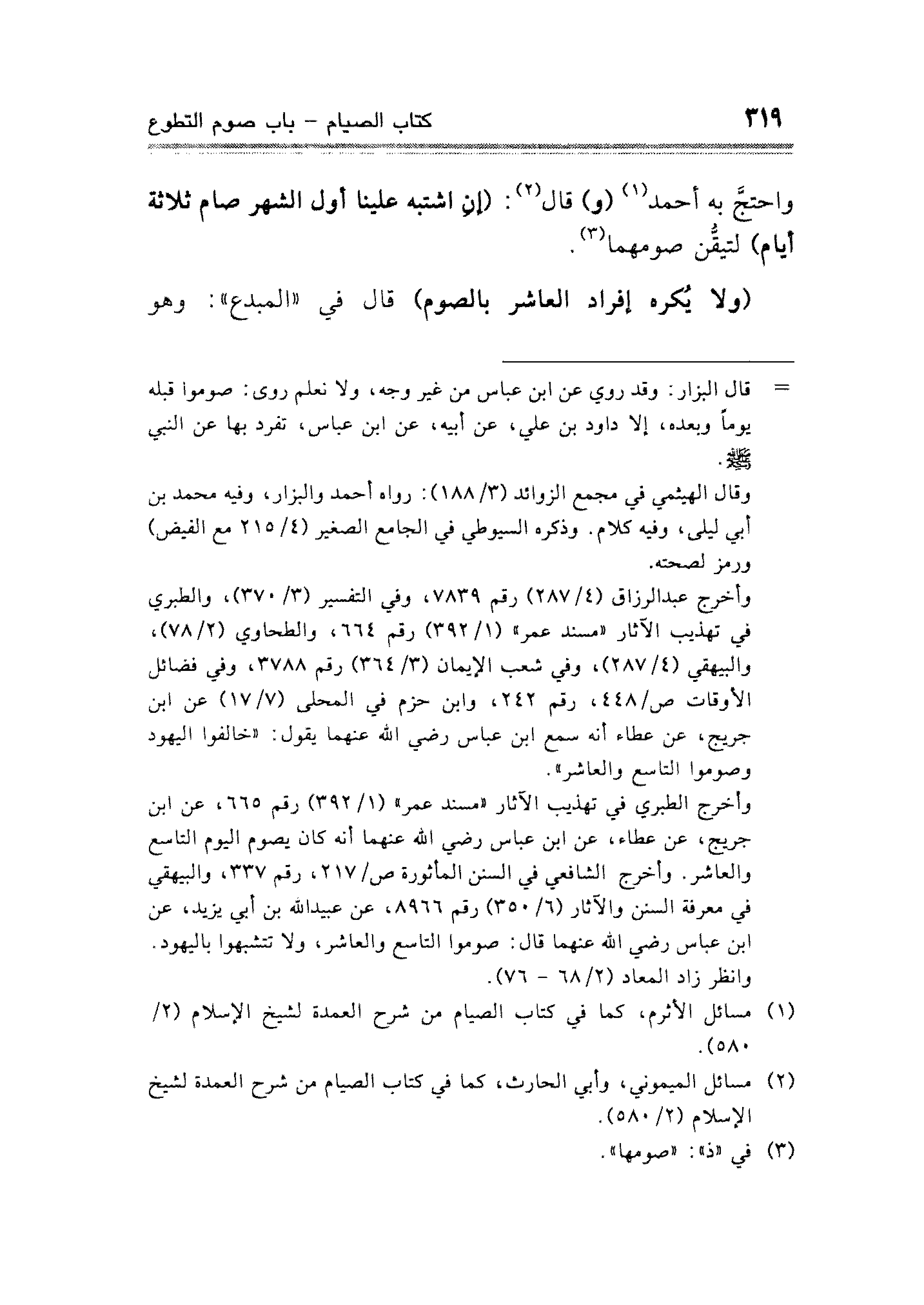 (ولا يُكره إفراد العاشر بالصوم) قال في "المبدع": وهو