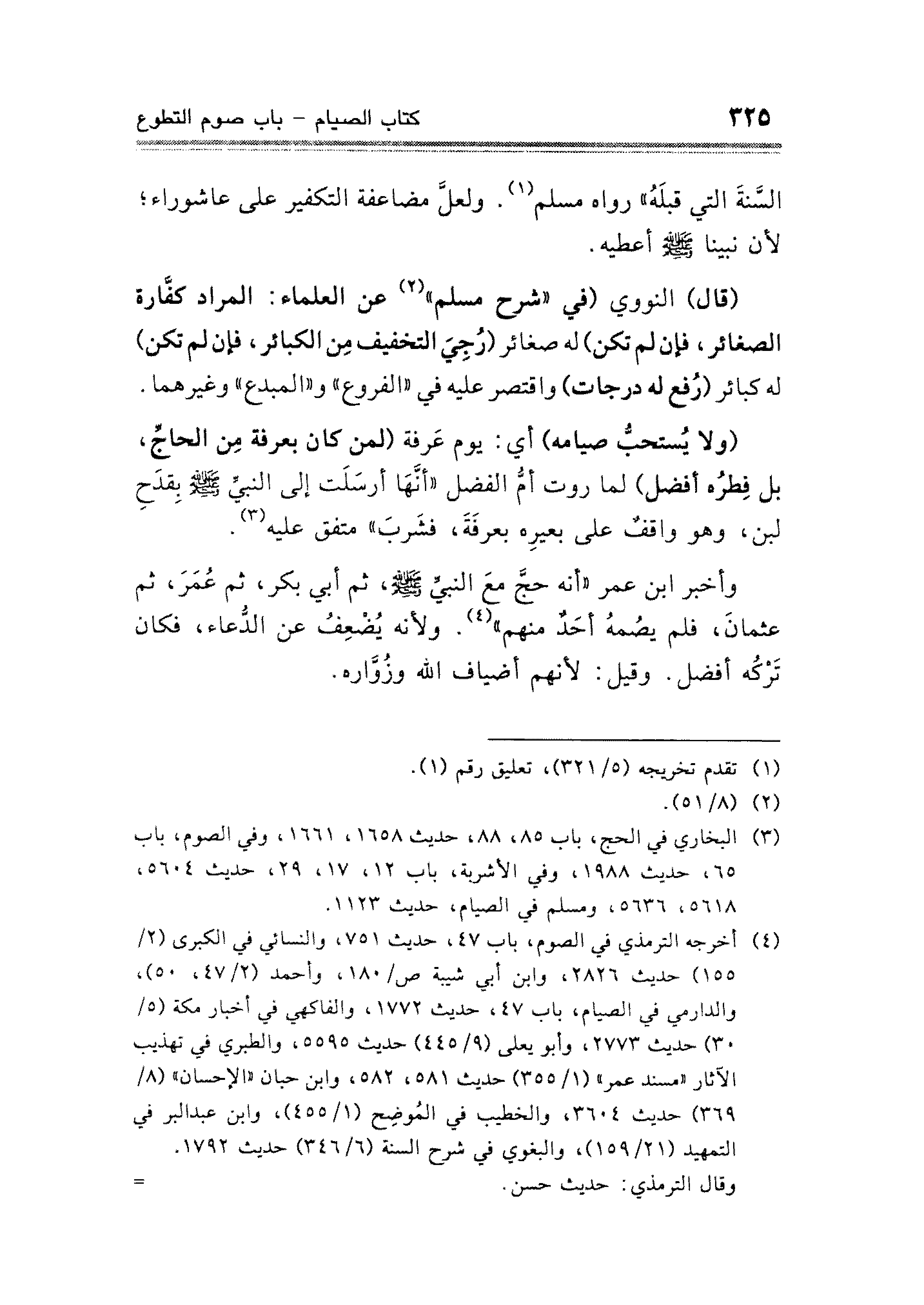 (ولا يُستحبُّ صيامه) أي: يوم عَرفة (لمن كان بعرفة مِن الحاجِّ، بل قِطرُه أفضل) لما روت أمُّ الفضل "أنَّهَا أرسَلَت إلى النبيِّ - صلى الله عليه وسلم - بِقدَحِ لبن، وهو واقفٌ على بعيرِه بعرفَةَ، فشَربَ" متفق عليه (¬٣).