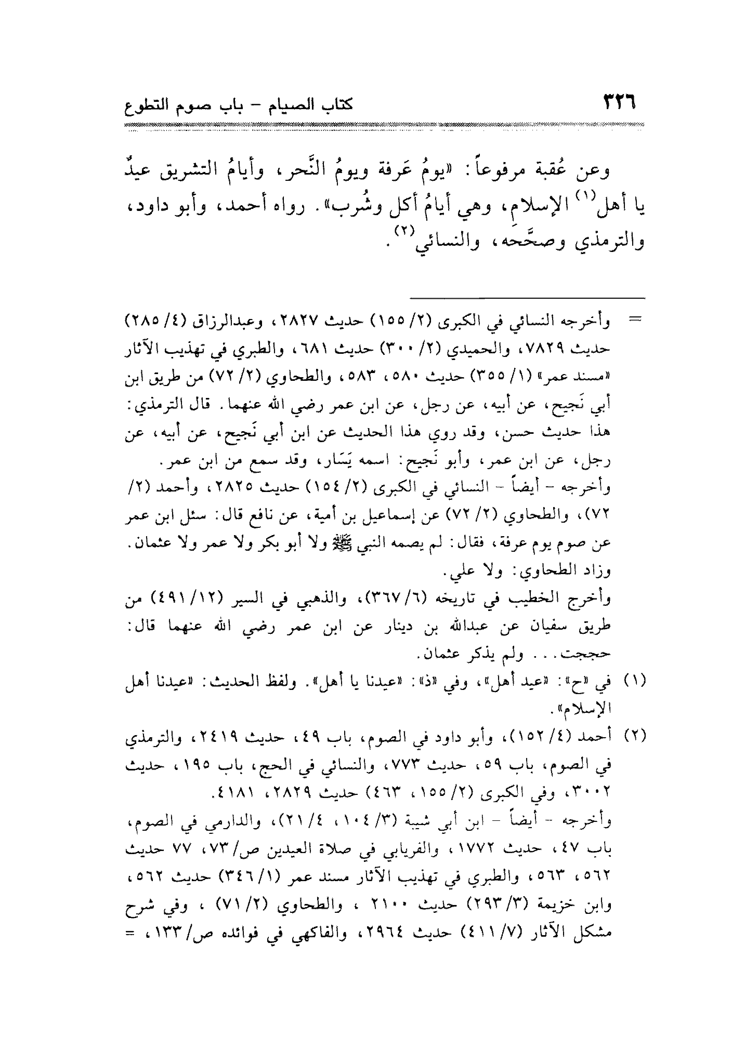 وعن عُقبة مرفوعًا: "يومُ عَرفة ويومُ النَّحر، وأيامُ التشريق عيدٌ يا أهل (¬١) الإسلامِ، وهي أيامُ أكل وشُرب". رواه أحمد، وأبو داود، والترمذي وصحَّحه، والنسائي (¬٢).
