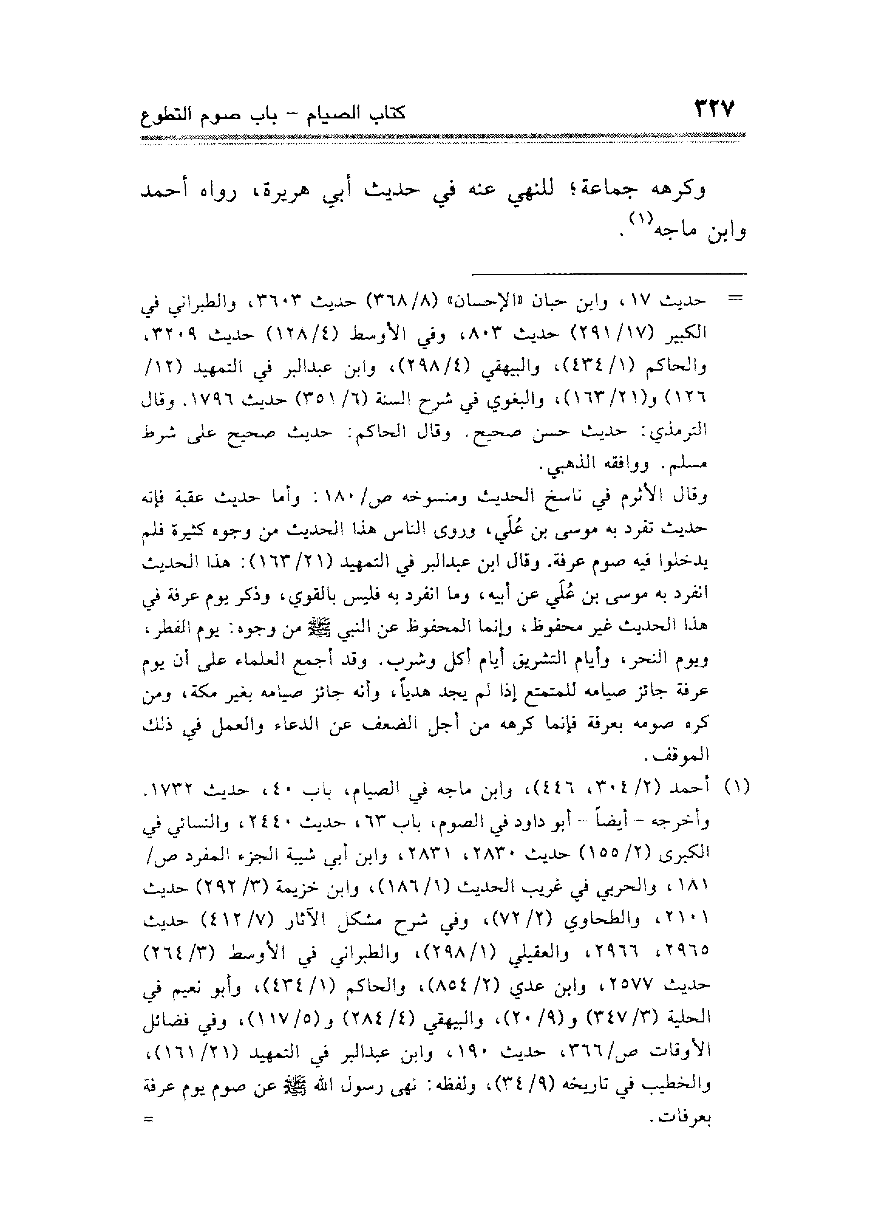 وقال الأثرم في ناسخ الحديث ومنسوخه ص / ١٨٠: وأما حديث عقبة فإنه حديث تفرد به موسى بن عُلَي، وروى الناس هذا الحديث من وجوه كثيرة فلم يدخلوا فيه صوم عرفة. وقال ابن عبد البر في التمهيد (٢١/ ١٦٣): هذا الحديث انفرد به موسى بن عُلَي عن أبيه، وما انفرد به فليس بالقوي، وذكر يوم عرفة في هذا الحديث غير محفوظ، وإنما المحفوظ عن النبي - صلى الله عليه وسلم - من وجوه: يوم الفطر، ويوم النحر، وأيام التشريق أيام أكل وشرب. وقد أجمع العلماء على أن يوم عرفة جائز صيامه للمتمتع إذا لم يجد هديًا، وأنه جائز صيامه بغير مكة، ومن كره صومه بعرفة فإنما كرهه من أجل الضعف عن الدعاء والعمل في ذلك الموقف.