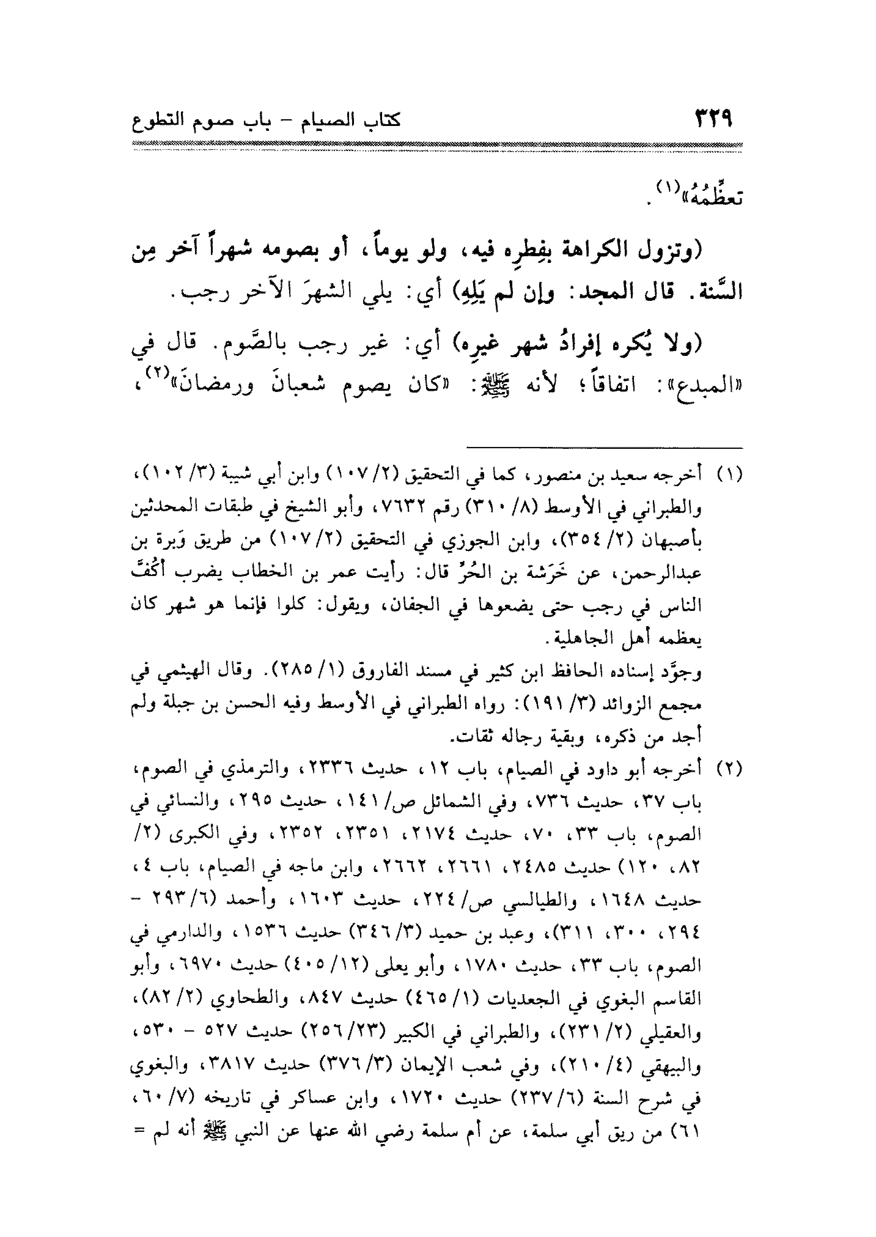 (ولا يُكره إفرادُ شهر غيرِه) أي: غير رجب بالصَّوم. قال في "المبدع": اتفاقًا؛ لأنه - صلى الله عليه وسلم -: "كان يصوم شعبانَ ورمضانَ" (¬٢)،