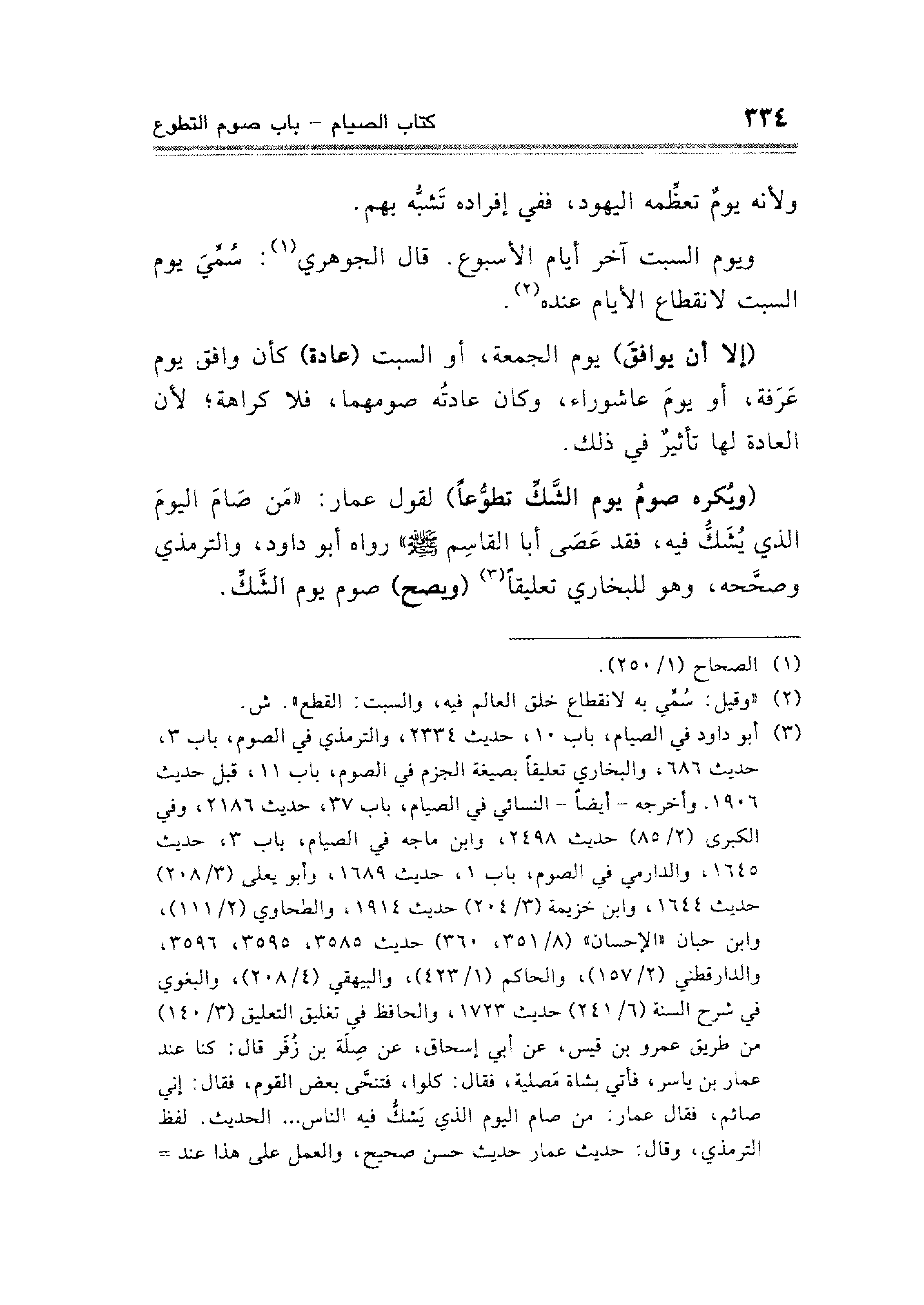 (ويُكره صومُ يوم الشك تطوعاً) لقول عمار: "مَن صَامَ اليومَ الذي يُشَك فِيه، فقد عَصَى أبا القاسِم - صَلَّى الله عليه وسلم - " رواه أبو داود، والترمذي وصحَّحه، وهو للبخاري تعليقاً (¬٣) (ويصح) صوم يوم الشَّكِّ.
