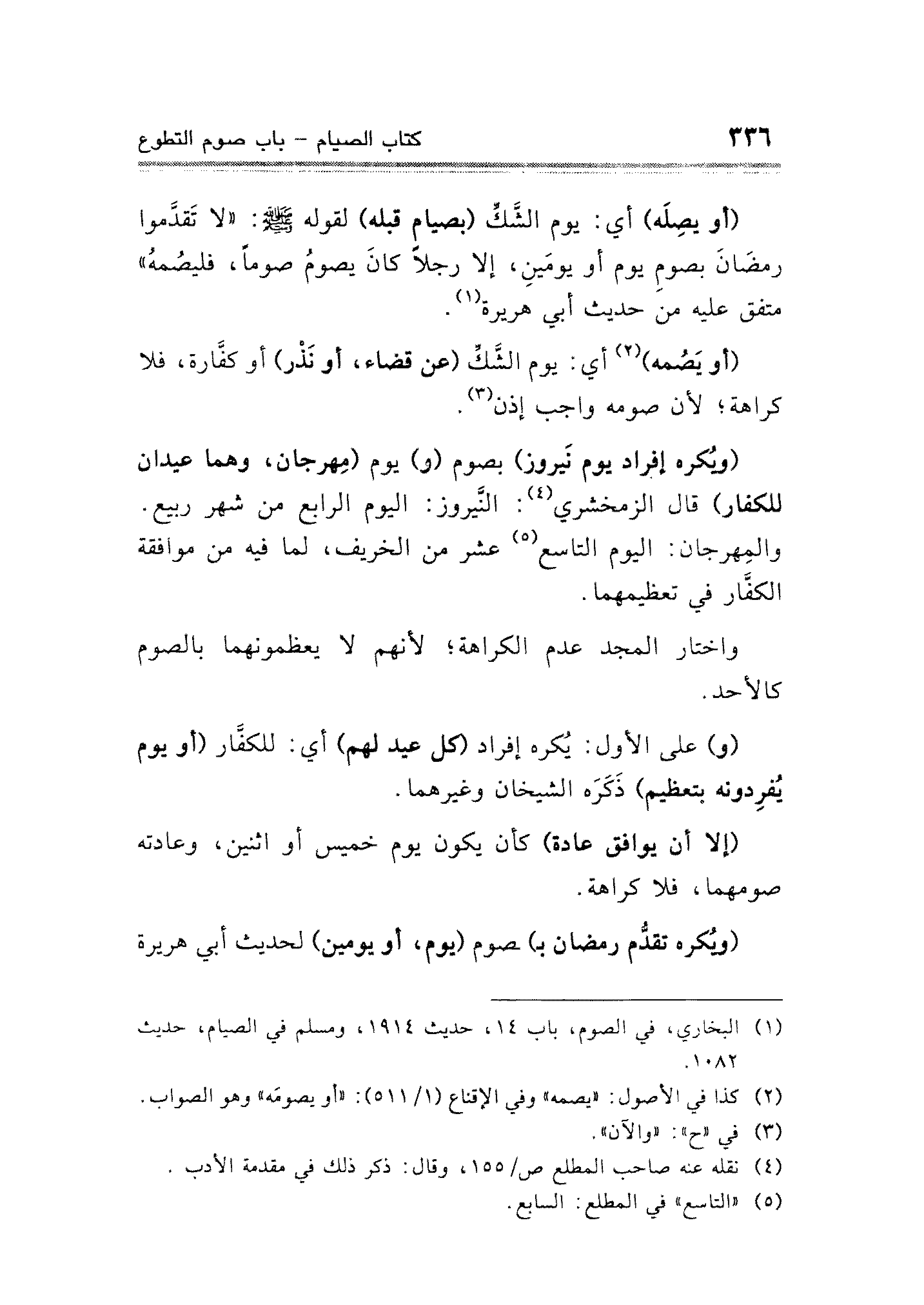 (ويكره إفراد يوم نَيروز) بصوم (و) يوم (مِهرجان، وهما عيدان للكفار) قال الزمخشري (¬٤): النيروز: اليوم الرابع من شهر ربيع. والمِهرجان: اليوم التاسع (¬٥) عشر من الخريف، لما فيه من موافقة الكفّار في تعظيمهما.