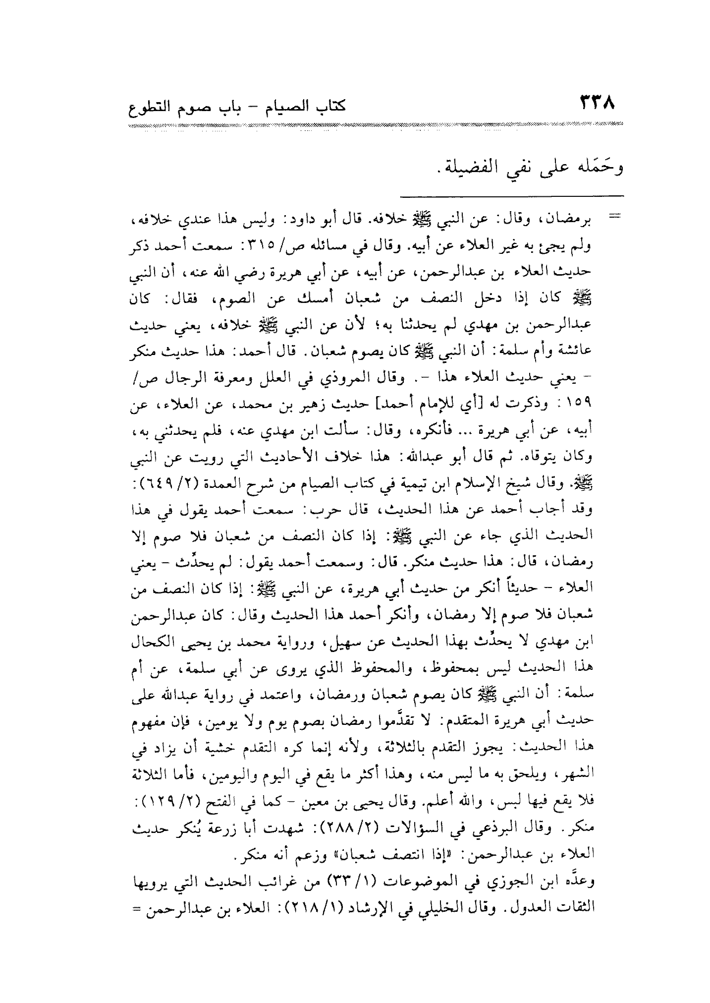 = برمضان، وقال: عن النبي - صلى الله عليه وسلم - خلافه. قال أبو داود: وليس هذا عندي خلافه، ولم يجئ به غير العلاء عن أبيه. وقال في مسائله ص/ ٣١٥: سمعت أحمد ذكر حديث العلاء بن عبد الرحمن، عن أبيه، عن أبي هريرة رضي الله عنه، أن النَّبيَّ - صلى الله عليه وسلم - كان إذا دخل النصف من شعبان أمسك عن الصوم، فقال: كان عبد الرحمن بن مهدي لم يحدثنا به؛ لأن عن النبي - صلى الله عليه وسلم - خلافه، يعني حديث عائشة وأم سلمة: أن النبي - صلى الله عليه وسلم - كان يصوم شعبان. قال أحمد: هذا حديث منكر - يعني حديث العلاء هذا -. وقال المروذي في العلل ومعرفة الرجال ص/ ١٥٩: وذكرت له [أي للإمام أحمد] حديث زهير بن محمد، عن العلاء، عن أبيه، عن أبي هريرة. . . فأنكره، وقال: سألت ابن مهدي عنه، فلم يحدثني به، وكان يتوفاه. ثم قال أبو عبد الله: هذا خلاف الأحاديث التي رويت عن النبي - صلى الله عليه وسلم -. وقال شيخ الإسلام ابن تيمية في كتاب الصيام من شرح العمدة (٢/ ٦٤٩): وقد أجاب أحمد عن هذا الحديث، قال حرب: سمعت أحمد يقول في هذا الحديث الذي جاء عن النبي - صلى الله عليه وسلم -: إذا كان النصف من شعبان فلا صوم إلَّا رمضان، قال: هذا حديث منكر. قال: وسمعت أحمد يقول: لم يحدث - يعني العلاء - حديثاً أنكر من حديث أبي هريرة، عن النبي - صلى الله عليه وسلم - إذا كان النصف من شعبان فلا صوم إلَّا رمضان، وأنكر أحمد هذا الحديث وقال: كان عبد الرحمن ابن مهدي لا يحدث بهذا الحديث عن سهيل، ورواية محمد بن يَحْيَى الكحال هذا الحديث ليس بمحفوظ، والمحفوظ الذي يروى عن أبي سلمة، عن أم سلمة: أن النبي - صلى الله عليه وسلم - كان يصوم شعبان ورمضان، واعتمد في رواية عبد الله على حديث أبي هريرة المتقدم: لا تقدِّموا رمضان بصوم يوم ولا يومين، فإن مفهوم هذا الحديث: يجوز التقدم بالثلاثة، ولأنه إنَّما كره التقدم خشية أن يزاد في الشهر، ويلحق به ما ليس منه، وهذا أكثر ما يقع في اليوم واليومين، فأمَّا الثلاثة فلا يقع فيها لبس، والله أعلم. وقال يحيي بن معين - كما في الفتح (٢/ ١٢٩): منكر. وقال البرذعي في السؤالات (٢/ ٢٨٨): شهدت أبا زرعة ينكر حديث العلاء بن عبد الرحمن: "إذا انتصف شعبان" وزعم أنَّه منكر.