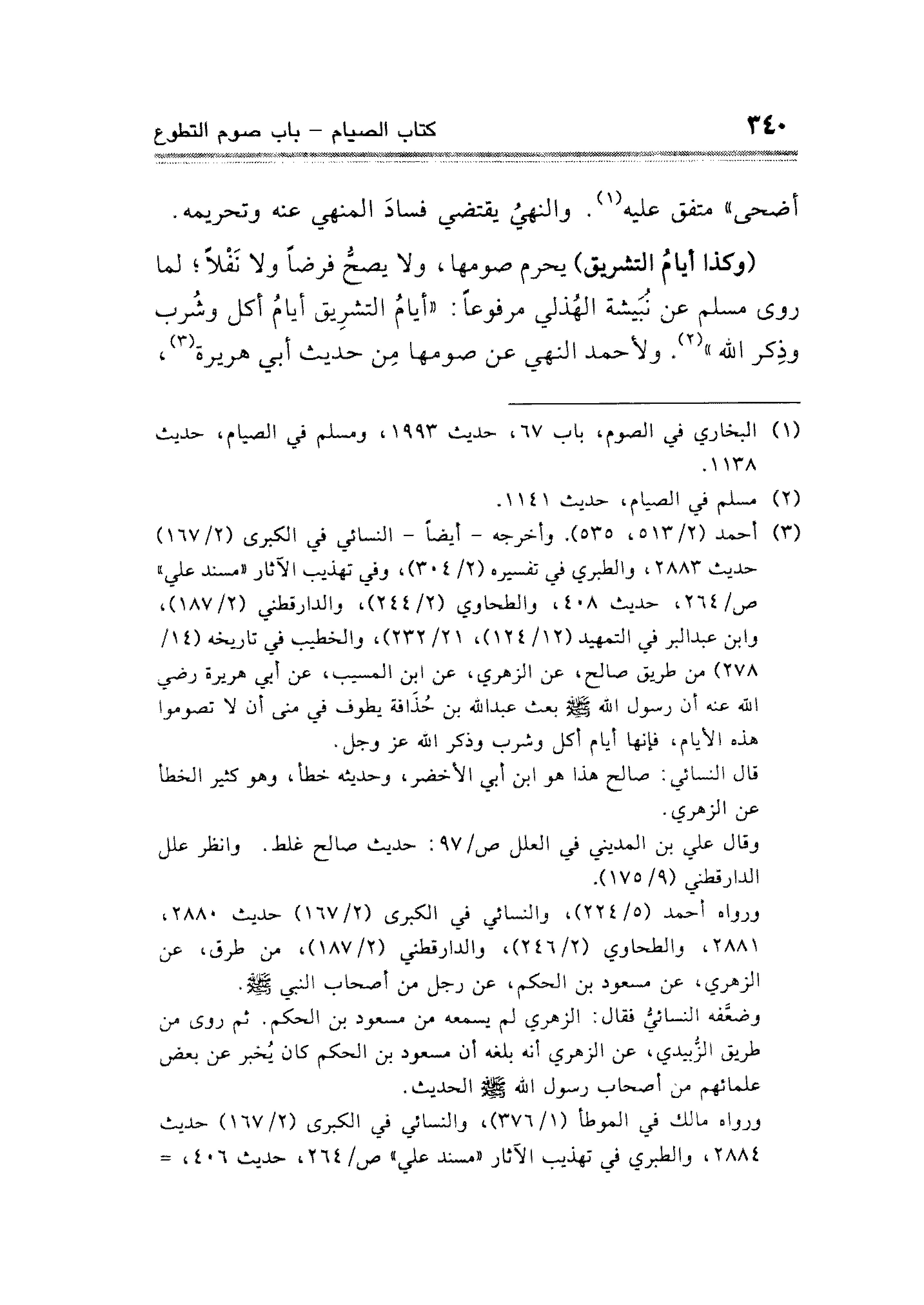 (¬٣) أحمد (٢/ ٥١٣، ٥٣٥). وأخرجه - أيضاً - النسائي في الكبرى (٢/ ١٦٧) حديث ٢٨٨٣، والطبري في تفسيره (٢/ ٣٠٤)، وفي تهذيب الآثار "مسند علي" ص/ ٢٦٤، حديث ٤٠٨، والطحاوي (٢/ ٢٤٤)، والدارقطني (٢/ ١٨٧)، وابن عبد البر في التمهيد (١٢/ ١٢٤)، (٢١/ ٢٣٢)، والخطيب في تاريخه (١٤/ ٢٧٨) من طريق صالح، عن الزُّهريّ، عن ابن المسيب، عن أبي هريرة رضي الله عنه أن رسول الله - صَلَّى الله عليه وسلم - بعث عبد الله بن حُذَافة يطوف في منى أن لا تصوموا هذه الأيَّام، فإنها أيَّام أكل وشرب وذكر الله عز وجل.