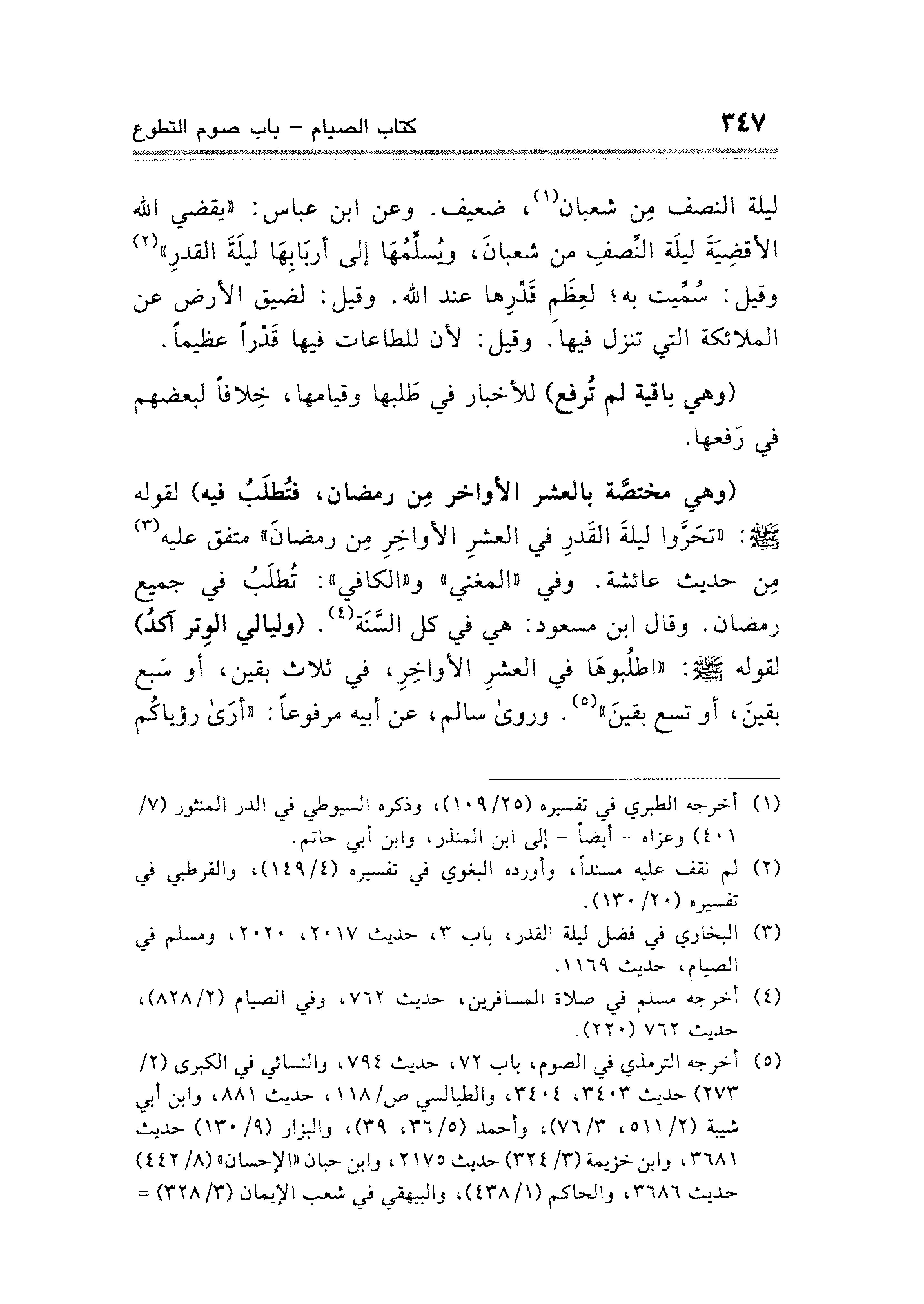 ليلة النصف مِن شعبان (¬١)، ضعيفة وعن ابن عباس: "يقضي الله الأقضِيَةَ ليلَة النصفِ من شعبانَ، ويُسلمها إلى أربَابهَا ليلَةَ القدرِ" (¬٢) وقيل: سُميت به، لعِظَمِ قَدْرِها عند الله. وقيل: لضيق الأرض عن الملائكة التي تنزل فيها. وقيل: لأن للطاعات فيها قَدراً عظيماً.