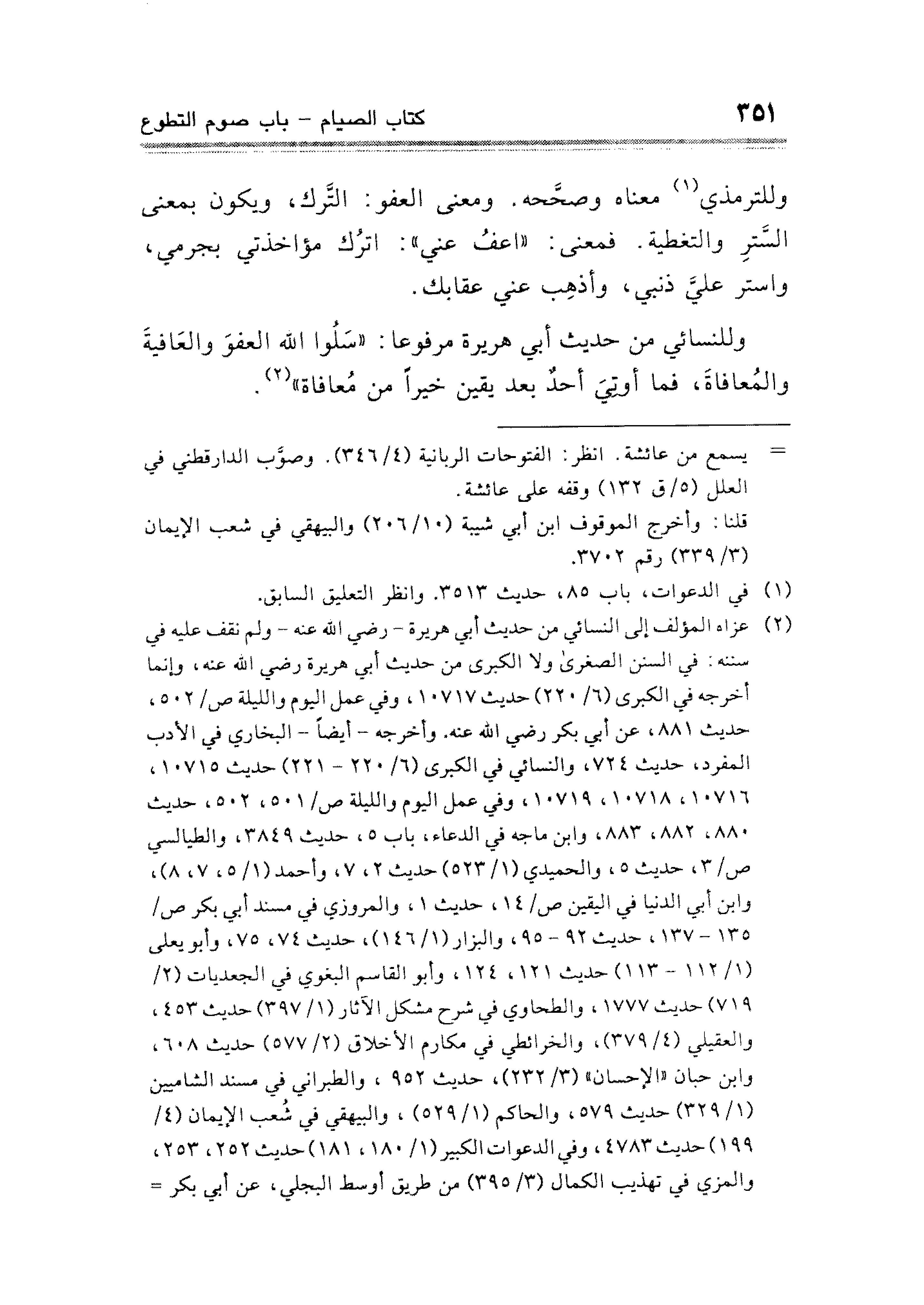 وللنسائي من حديث أبي هريرة مرفوعا: "سَلوا الله العفوَ والعَافيةَ والمُعافاةَ، فما أوتيَ أحدٌ بعد يقين خيراً من مُعافاة" (¬٢).