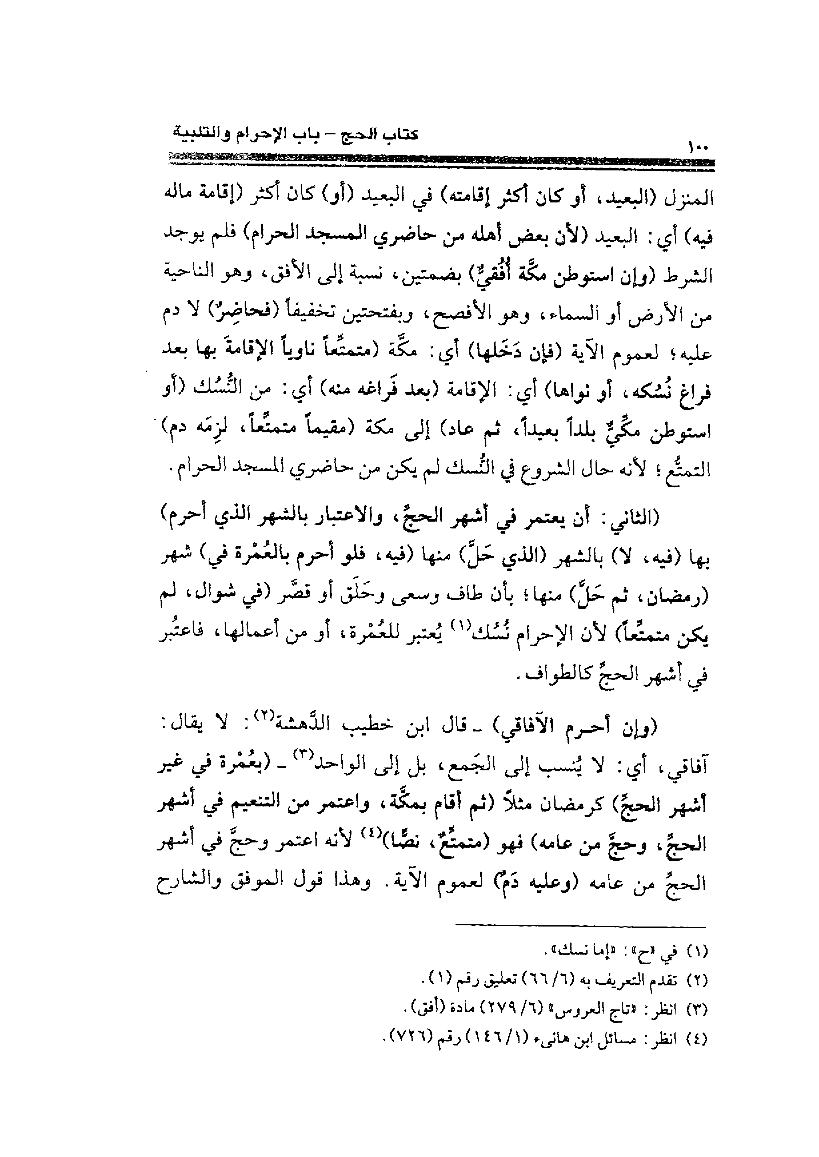 المنزل (البعيد، أو كان أكثر إقامته) في البعيد (أو) كان أكثر (إقامة ماله فيه) أي: البعبد (لأن بعض أهله من حاضري المسجد الحرام) فلم يوجد الشرط (وإن استوطن مكة أُفُقيٌّ) بضمتين، نسبة إلى الأفق، وهو الناحية من الأرض أو السماء، وهو الأفصح، وبفتحتين تخفيفًا (فحاضِرٌ) لا دم عليه؛ لعموم الآية (فإن دَخَلها) أي: مكَّة (متمتعًا ناويًا الإقامةَ بها بعد فراغ نُسُكه، أو نواها) أي: الإقامة (بعد فَراغه منه) أي: من النُّسُك (أو استوطن مكيٌّ بلدًا بعيدًا، ثم عاد) إلى مكة (مقيمًا متمتًعًا، لزِمَه دم) التمتُّع؛ لأنه حال الشروع في النُّسك لم يكن من حاضري المسجد الحرام.