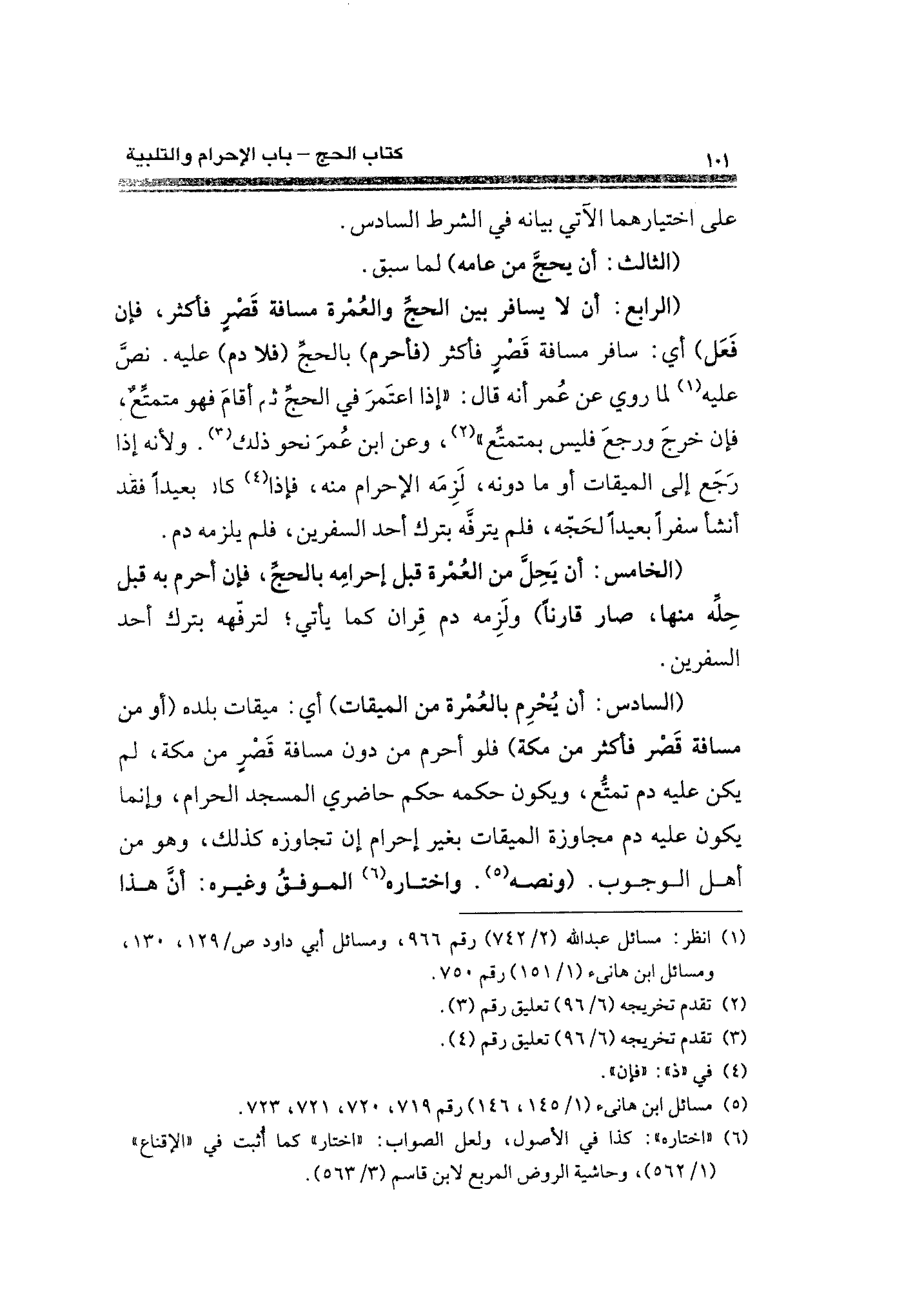 (السادس: أن يُحْرِم بالعُمْرة من الميقات) أي: ميقات بلده (أو من مسافة قَصْر فأكثر من مكة) فلو أحرم من دون مسافة قَصْرٍ من مكة، لم يكن عليه دم تمتُّع، ويكون حكمه حكم حاضري المسجد الحرام، وإنما يكون عليه دم مجاوزة الميقات بغير إحرام إن تجاوزه كذلك، وهو من أهل الوجوب. (ونصه (¬٥). واختاره (¬٦) الموفقُ وغيره: أنَّ هذا
