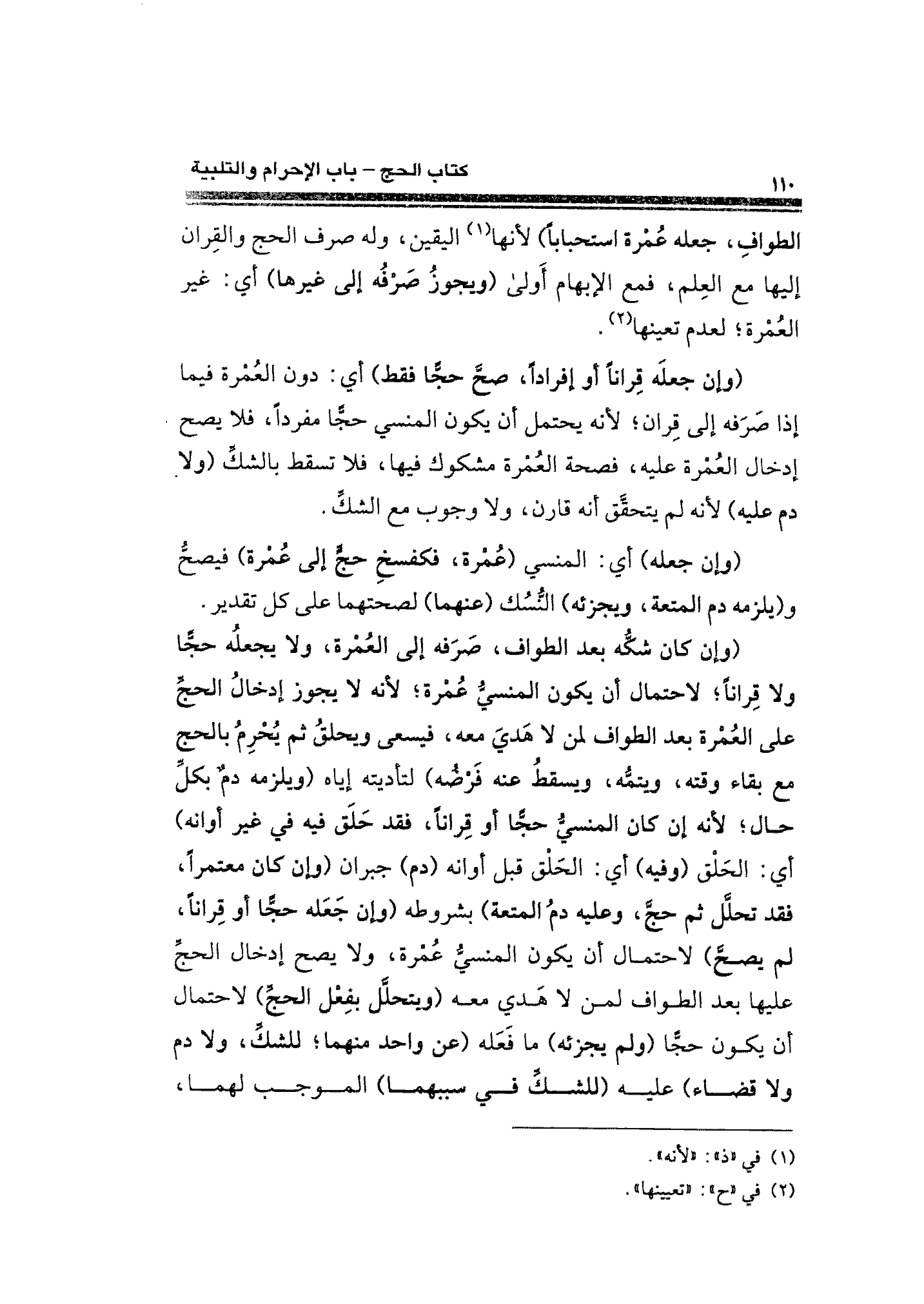 الطوافِ، جعله عُمْرة استحبابًا) لأنها (¬١) اليقين، وله صرف الحج والقِران إليها مع العِلم، فمع الإبهام أَولى (ويجوزُ صَرْفُه إلى غيرها) أي: غير العُمْرة؛ لعدم تعينها (¬٢).