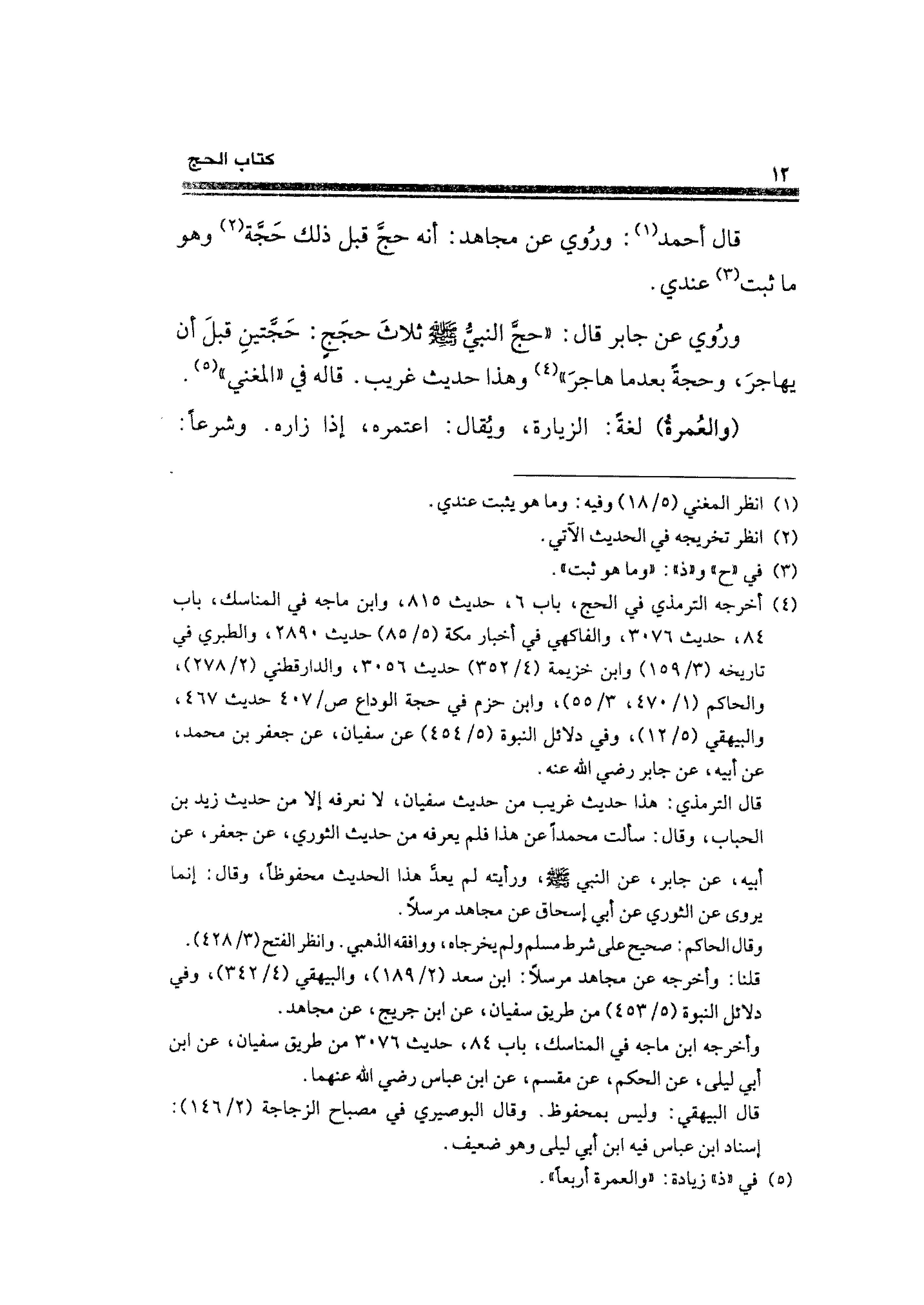 ورُوي عن جابر قال: "حجَّ النبيُّ - صلى الله عليه وسلم - ثلاثَ حجَجٍ: حَجَّتينِ قبلَ أن يهاجرَ، وحجةً بعدما هاجرَ" (¬٤) وهذا حديث غريب. قاله في "المغني" (¬٥).
