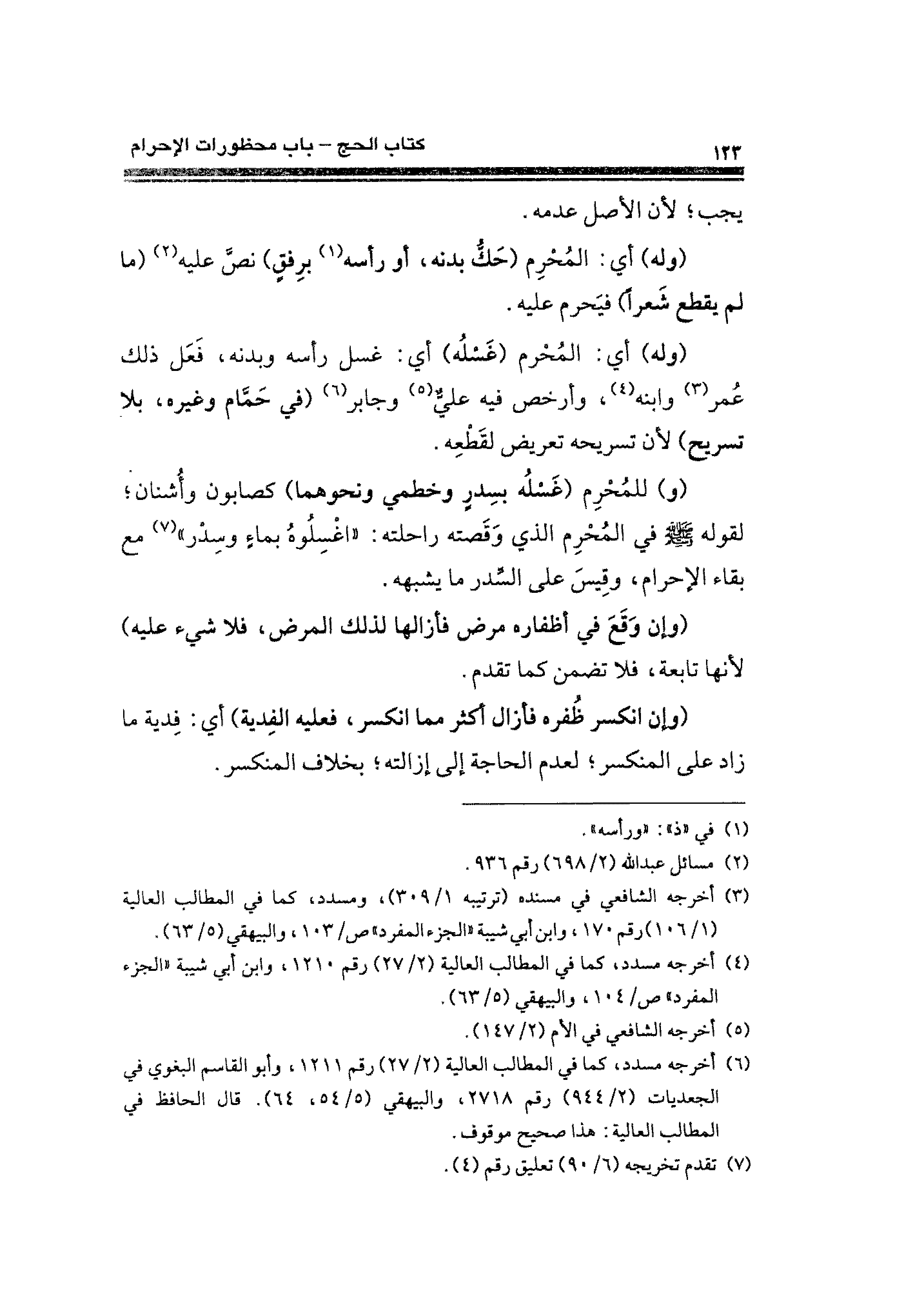 (و) للمُحْرِم (غَسْلُه بسِدرٍ وخطمي ونحوهما) كصابون وأُشنان؛ لقوله - صلى الله عليه وسلم - في المُحْرِم الذي وَقَصته راحلته: "اغْسِلُوهُ بماءٍ وسِدْر" (¬٧) مع بقاء الإحرام، وقِيسَ على السِّدر ما يشبهه.