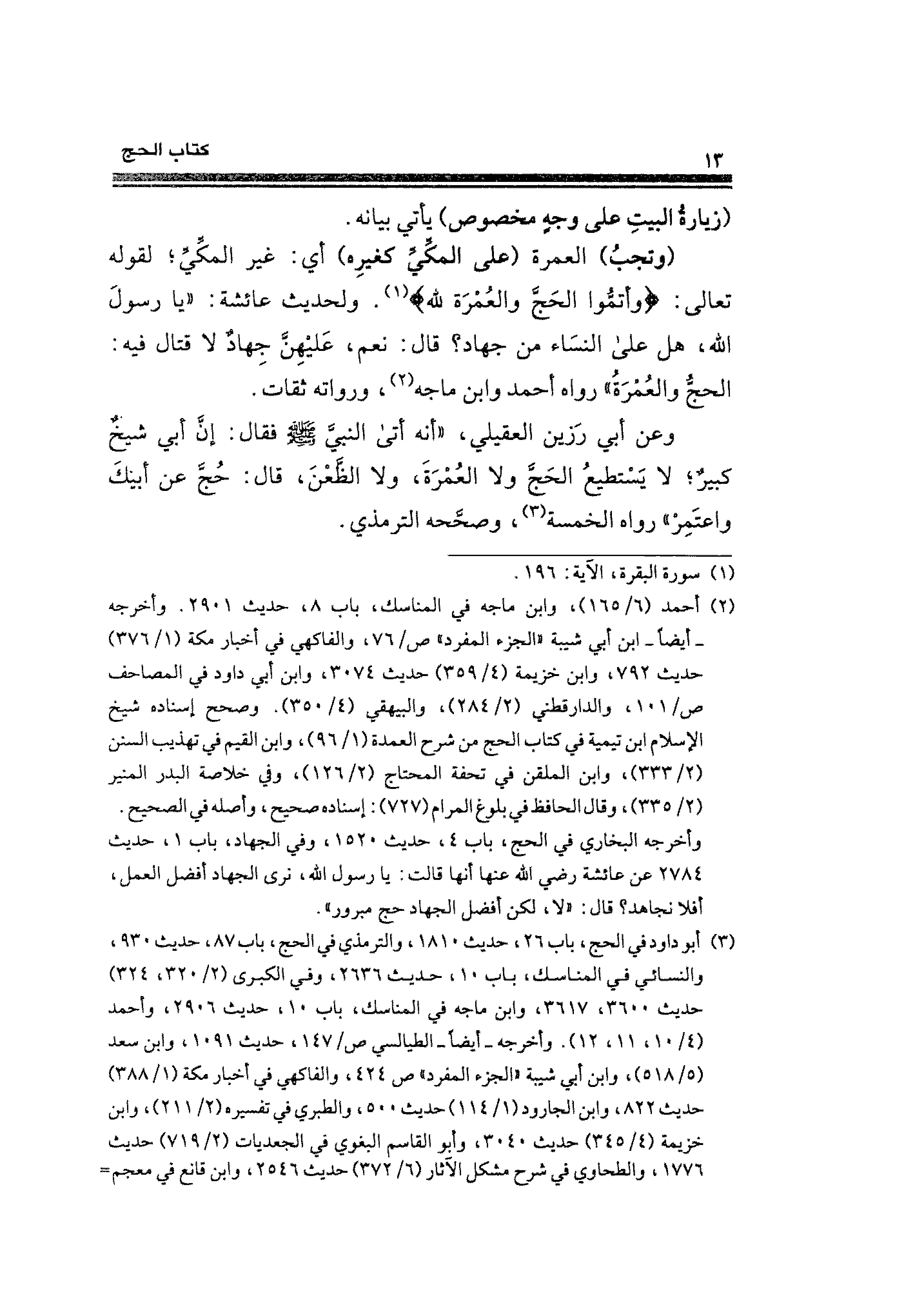 (وتجبُ) العمرة (على المكِّيِّ كغيرِه) أي: غير المكِّيِّ؛ لقوله تعالى: {وَأَتِمُّوا الْحَجَّ وَالْعُمْرَةَ لِلَّهِ} (¬١). ولحديث عائشة: "يا رسولَ الله، هل على النسَاء من جهاد؟ قال: نعم، عَليهِنَّ جِهادٌ لا قتال فيه: الحجُّ والعُمْرَةُ" رواه أحمد وابن ما جه (¬٢)، ورواته ثقات.