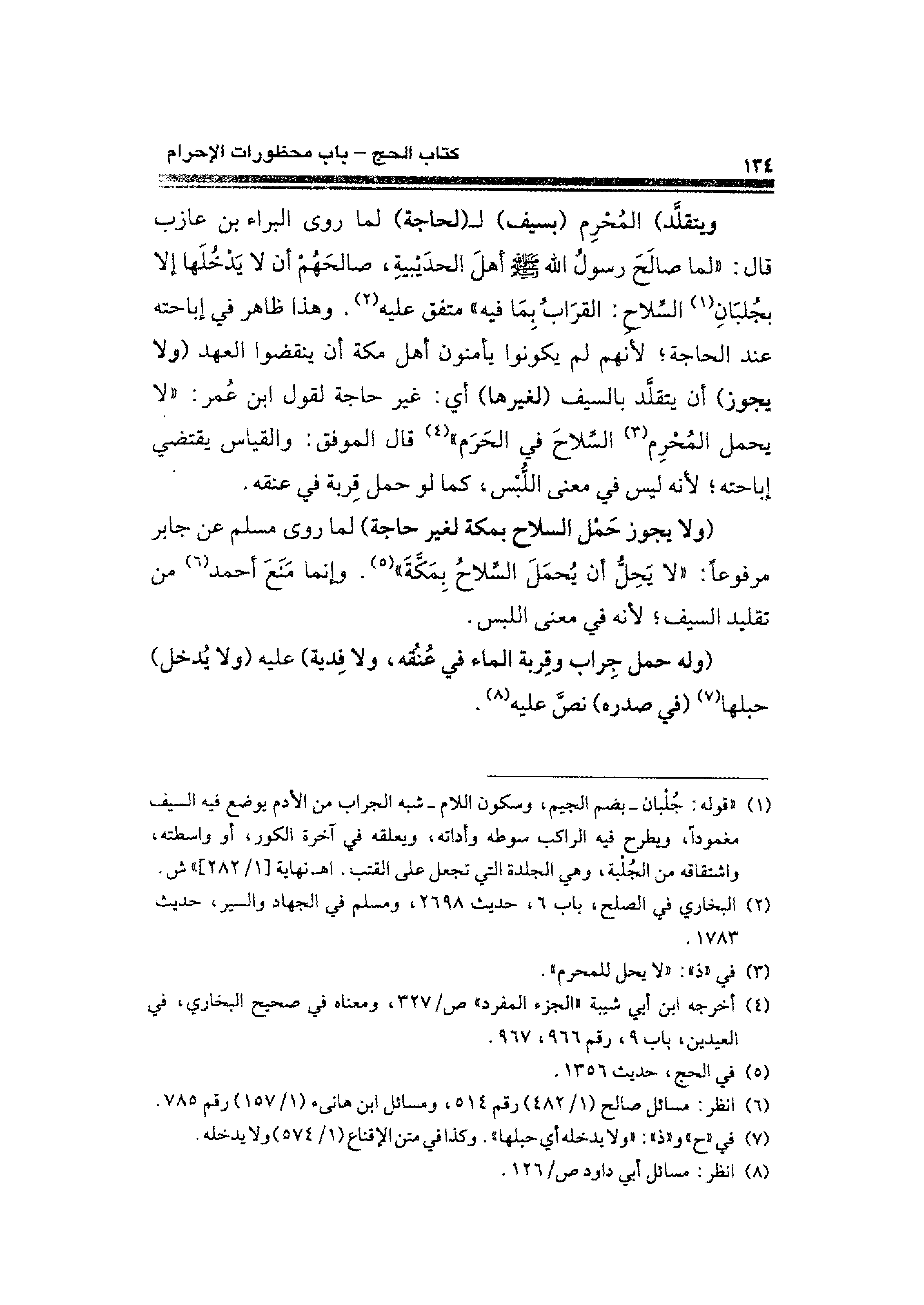 ويتقلَّد) المُحْرِم (بسيف) لـ (لحاجة) لما روى البراء بن عازب قال: "لما صالحَ رسولُ الله - صلى الله عليه وسلم - أهلَ الحدَيبيةِ، صالحَهُمْ أن لا يَدْخُلَها إلا بجُلبَانِ (¬١) السِّلاحِ: القرَابُ بِمَا فيه" متفق عليه (¬٢). وهذا ظاهر في إباحته عند الحاجة؛ لأنهم لم يكونوا يأمنون أهل مكة أن ينقضوا العهد (ولا يجوز) أن يتقلَّد بالسيف (لغيرها) أي: غير حاجة لقول ابن عُمر: "لا يحمل المُحْرِم (¬٣) السِّلاحَ في الحَرَم" (¬٤) قال الموفق: والقياس يقتضي إباحته؛ لأنه ليس في معنى اللُّبْس، كما لو حمل قِربة في عنقه.