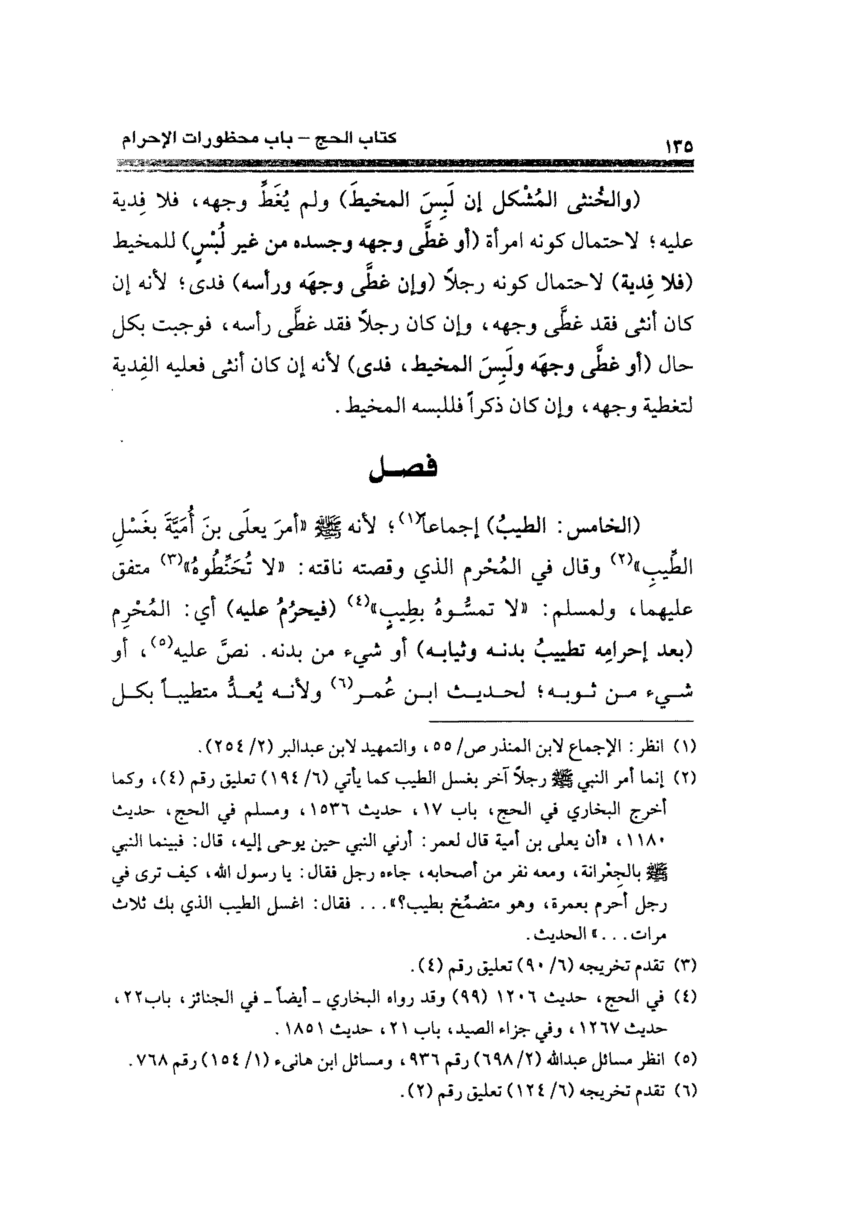 (الخامس: الطيبُ) إجماعًا (¬١)؛ لأنه - صلى الله عليه وسلم - "أمرَ يعلَى بنَ أُمَيَّةَ بغَسْلِ الطِّيبِ" (¬٢) وقال في المُحْرم الذي وقصته ناقته: "لا تُحَنِّطُوهُ" (¬٣) متفق عليهما، ولمسلم: "لا تمسُّوهُ بطِيبٍ" (¬٤) (فيحرُمُ عليه) أي: المُحْرِم (بعد إحرامِه تطييبُ بدنه وثيابه) أو شيء من بدنه. نصَّ عليه (¬٥)، أو شيء من ثوبه؛ لحديث ابن عمر (¬٦) ولأنه يُعدُّ متطيبًا بكل