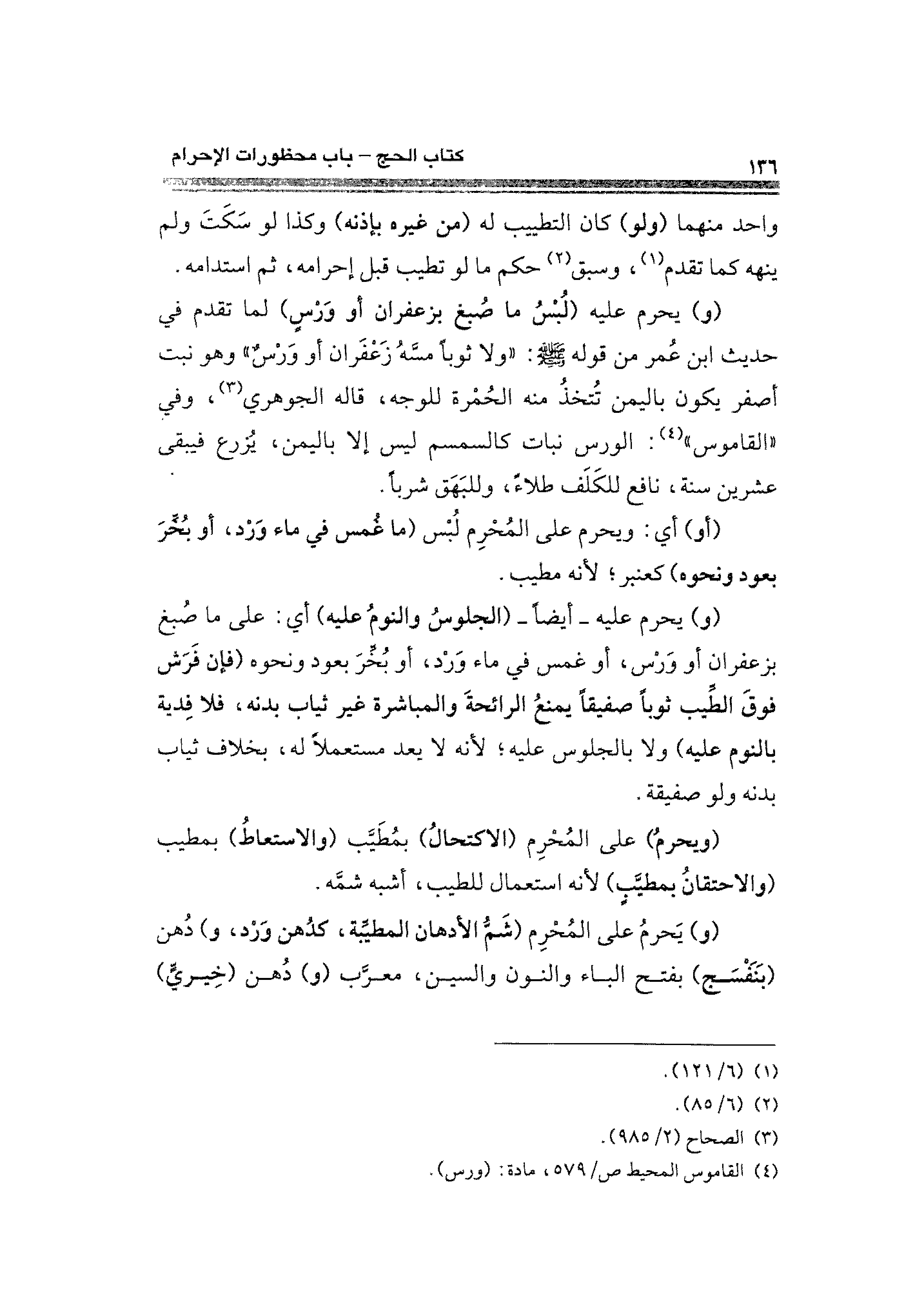 (و) يحرم عليه (لُبْسُ ما صُبغ بزعفران أو وَرسٍ) لما تقدم في حديث ابن عُمر من قوله - صلى الله عليه وسلم -: "ولا ثوبًا مسَّه زَعْفَران أو وَرْسٌ" وهو نبت أصفر يكون باليمن تُتخذُ منه الحُمْرة للوجه، قاله الجرهري (¬٣)، وفي "القاموس" (¬٤): الورس نبات كالسمسم ليس إلا باليمن، يُزرع فيبقى عشرين سنة، نافع للكَلَف طلاءً، وللبَهَق شربًا.